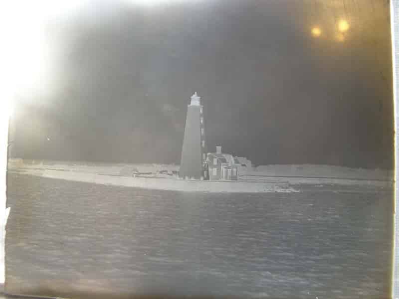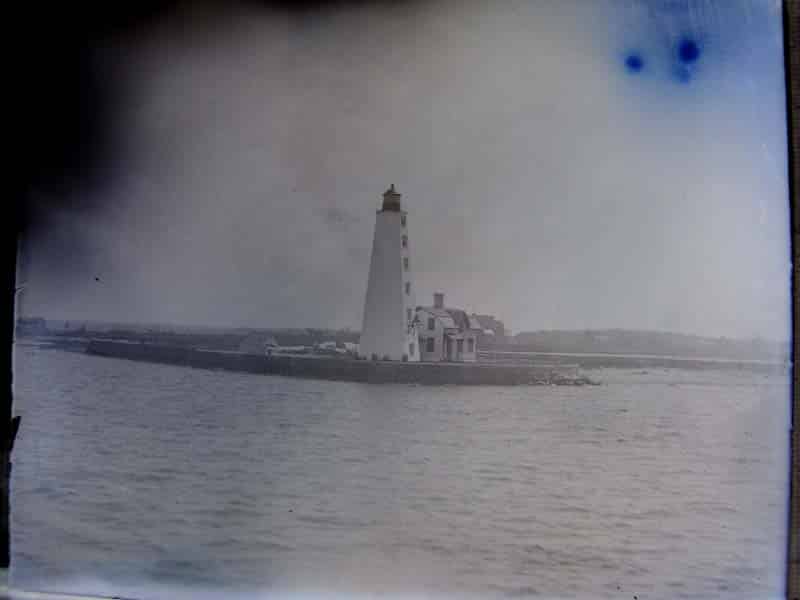 - (glass negative) Lynde Point Lighthouse, Old Saybrook, Conn. c.1900. Clear glass plate negative captures nicely the Old Saybrook, on the west side of the entrance to the Connecticut River, was a prosperous town full of sea captains’ homes, and was for many years the only major stop on the railroad between New London and New Haven. The growth of commerce along the river—navigable as far north as Hartford—as well as fishing based in Old Saybrook, led to increased shipping traffic. To mark the entrance to the Connecticut River and the harbor of Old Saybrook, officials decided to erect a lighthouse in 1802. Land was purchased from William Lynde for $225, and the 35-foot wooden tower was built by New London carpenter Abisha Woodward in 1803. The first lighthouse was criticized by mariners for being too dim and too short. A group petitioned for the tower to be raised by 25 feet, but it was decided to rebuild the lighthouse instead. A new 65-foot brownstone tower, seen here, was erected in 1838. The lighthouse is similar to the masonry towers built earlier at New London and Faulkner’s Island, but this one is considered to represent the finest work of the three. The system of 10 lamps and reflectors was replaced in 1852 by a fourth-order Fresnel lens. A fifth-order lens was installed in 1890. A fog bell was added in 1854. Large image measures 4” x 5” and is clear and fairly close. Would provide a clear print image. (VG). $42.