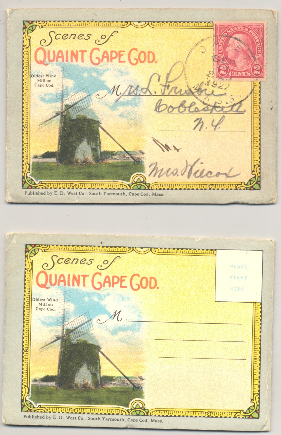 12309k. Souvenir Folder Quaint Cape Cod c.1927. Wonderful early miniature fold-out color lithograph postcard views includes 16 scenes (2 sided) including Cape Cod views, homes, shops, library, King’s Highway, old windmill and more. Each view measures 3” x 4” and all fold out to 32”. With original covers. Published by E.D. West Company, South Yarmouth. Meant to be folded and mailed, this one postmarked 1927. Intact, overall clean. Charming period views. (VG). $16.
