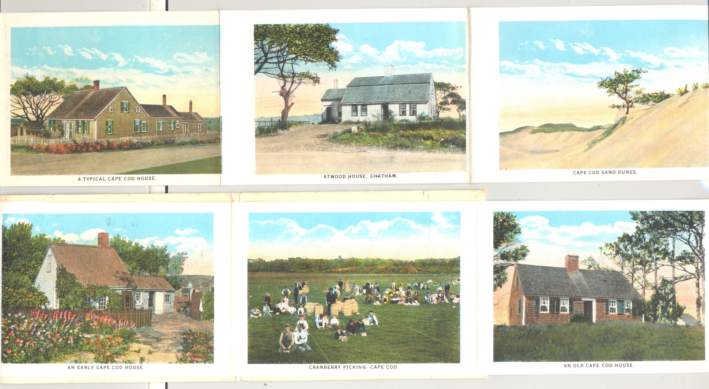 12309o. Souvenir Folder Quaint Cape Cod c.1927. Wonderful early miniature fold-out color lithograph postcard views includes 16 scenes (2 sided) including Cape Cod views, homes, shops, library, King’s Highway, old windmill and more. Each view measures 3” x 4” and all fold out to 32”. With original covers. Published by E.D. West Company, South Yarmouth. Meant to be folded and mailed, this one unused. Intact, overall clean. Charming period views. (VG+). $18.
