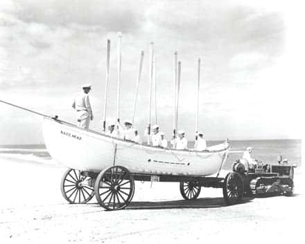 13433a. (copy photo) U.S. Coast Guard Surfboat Crew Oars Up, Nags Head, North Carolina c.1940’s view.