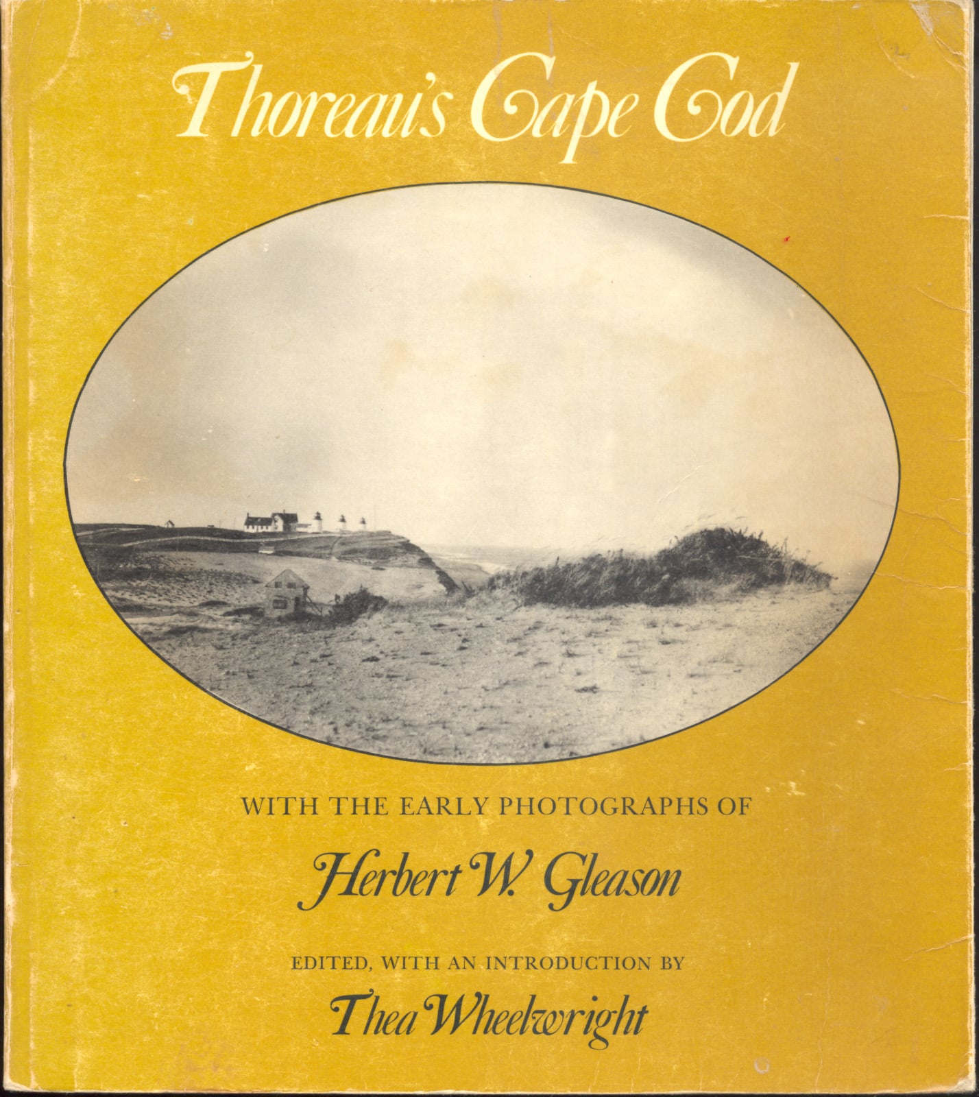 20440 na. THOREAU’S CAPE COD WITH THE EARLY PHOTOGRAPHS OF HERBERT W. GLEASON. Barre. 1973. Edited by Thea Wheelwright with Introduction. 96 p. Soft wraps. This is a very unique book that will appeal greatly to those who love the stunning landscape of Cape Cod and the words of Henry David Thoreau. This book features the early photography of Herbert W. Gleason. At the very beginning of the 20th century a remarkable collaboration was initiated when Gleason, former minister and inspired photographer, set out on Cape Cod with his camera to follow exactly in the footsteps of a man who had traveled there 54 years before. Herbert Gleason’s photographs are excellent in themselves. His reverence for nature, and his ability to reveal its beauty through the camera, led him to eventually work with other naturalists such as John Muir, John Burroughs and Luther Burbank. Henry David Thoreau’s account of his journey on the Cape fascinated Gleason, and he decided to meticulously record in photographs the scenes, which had remained unchanged, that Thoreau had described. Each of the 50 photos included is juxtaposed with the inspiring words and prose of Thoreau. Some of the photographs include: Pleasant Bay at South Orleans, Mill Pond, Chatham, Harwich Port, the Sound, Muddy Creek toward Pleasant Bay, Crystal Pond, Orleans, Nauset Three Sisters Lighthouses and Bluffs, Eastham, Wellfleet Bluffs from Cahoon’s Hollow, Wellfleet Dunes, Truro, Herring Pond, Chatham, North Truro, Pamet River, The Clay Pounds, Telegraph Hill, Provincetown, and many more. This book finally fulfills Gleason’s intention to merge the camera eye with Thoreau’s mind’s eye. The physical character of the Cape is here – the severe beauty of beach and dune, the expanse of ocean and sky. A feast for the eyes and soul. Clean, tight, moderate wear to wraps, gift inscription inside front wrap. (VG+). $34.