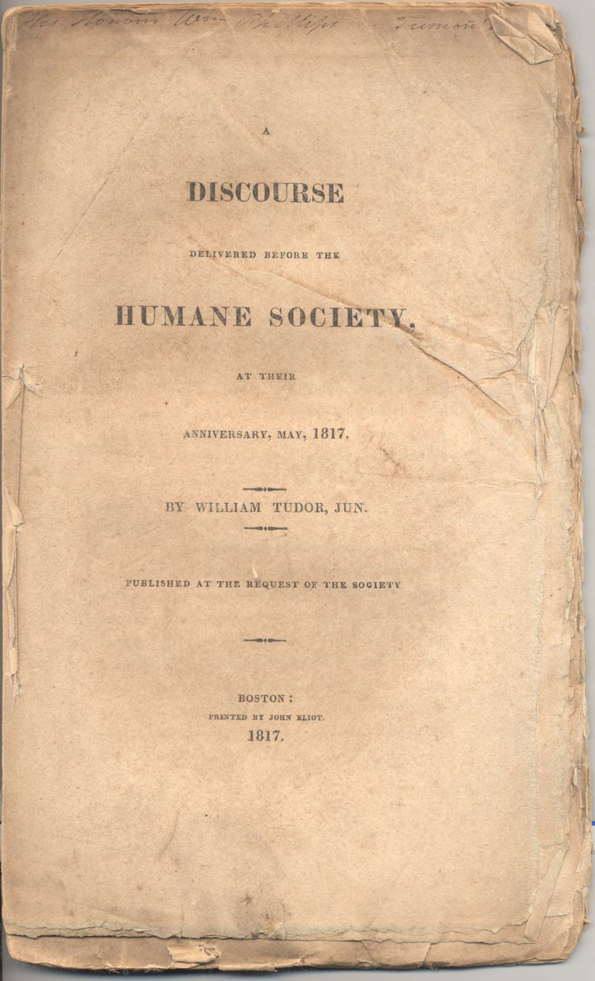 2105b. A DISCOURSE DELIVERED BEFORE THE HUMANE SOCIETY AT THEIR ANNIVERSARY, MAY 1817. William Tudor, JUN. Boston. 1817. 64pp. In addition to sermon, includes a detailed account of the origin and organization of the Massachusetts Humane Society, property and expenses of the Society, premiums awarded as well as a listing of members and officers. (G). $68.