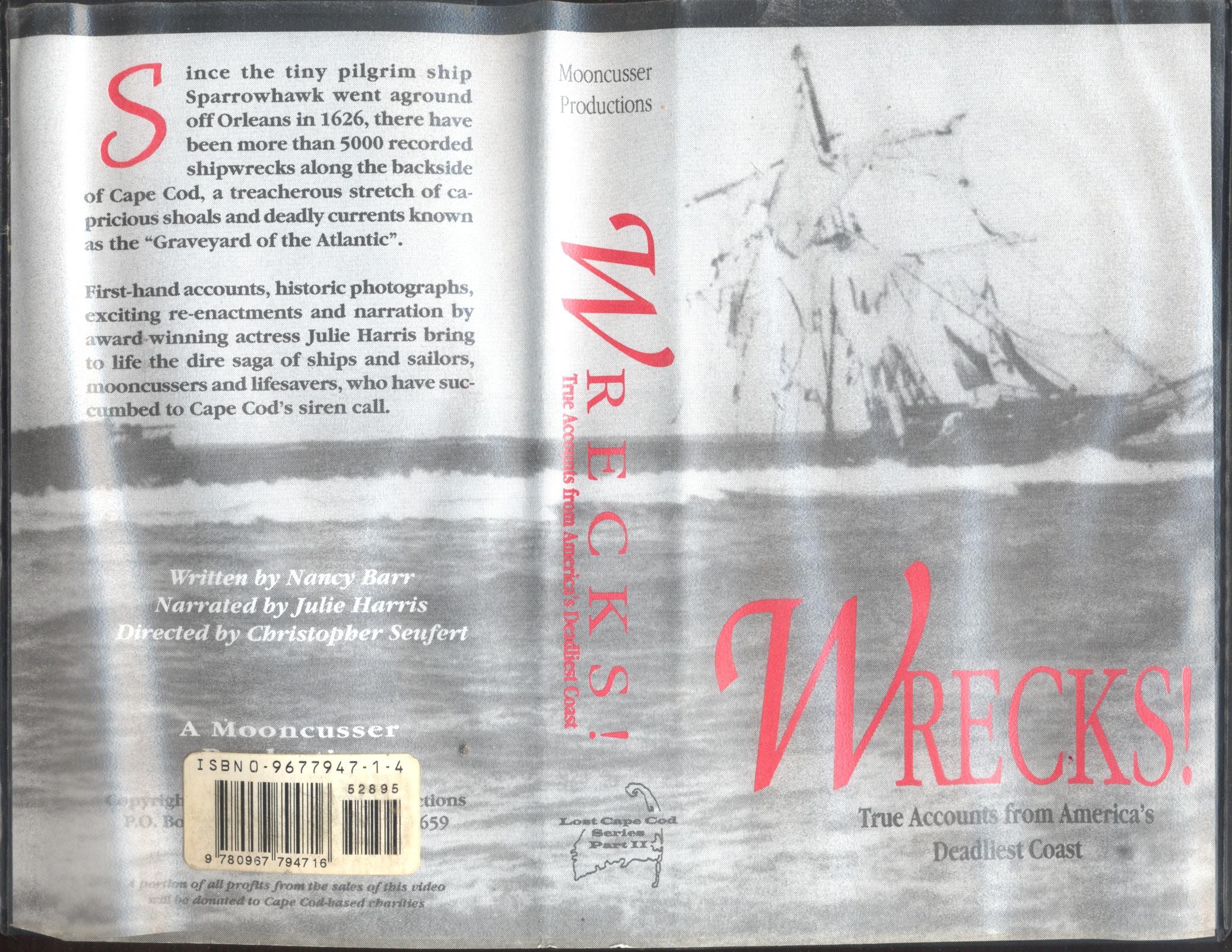 20171. (video tape) WRECKS! True Accounts from America’s Deadliest Coast. Mooncusser Productions. More than 5000 recorded shipwrecks occurred on the back side of Cape Cod. First hand accounts, historic photographs, exciting re-enactments and narration by award winning actress Julie Harris bring to life the saga of mooncussers and lifesavers on outer Cape Cod. $28.95. (sale 1/2 price)