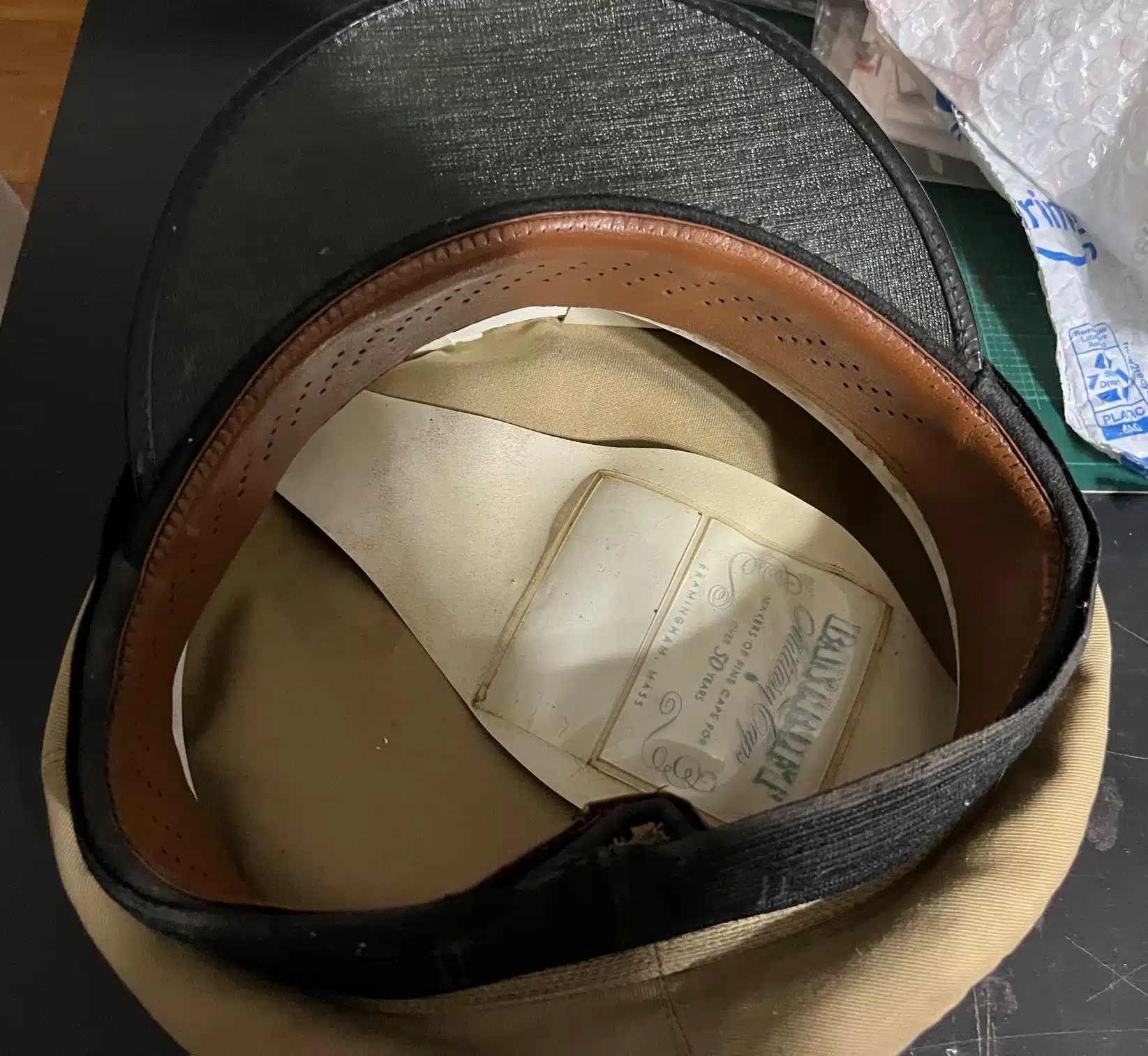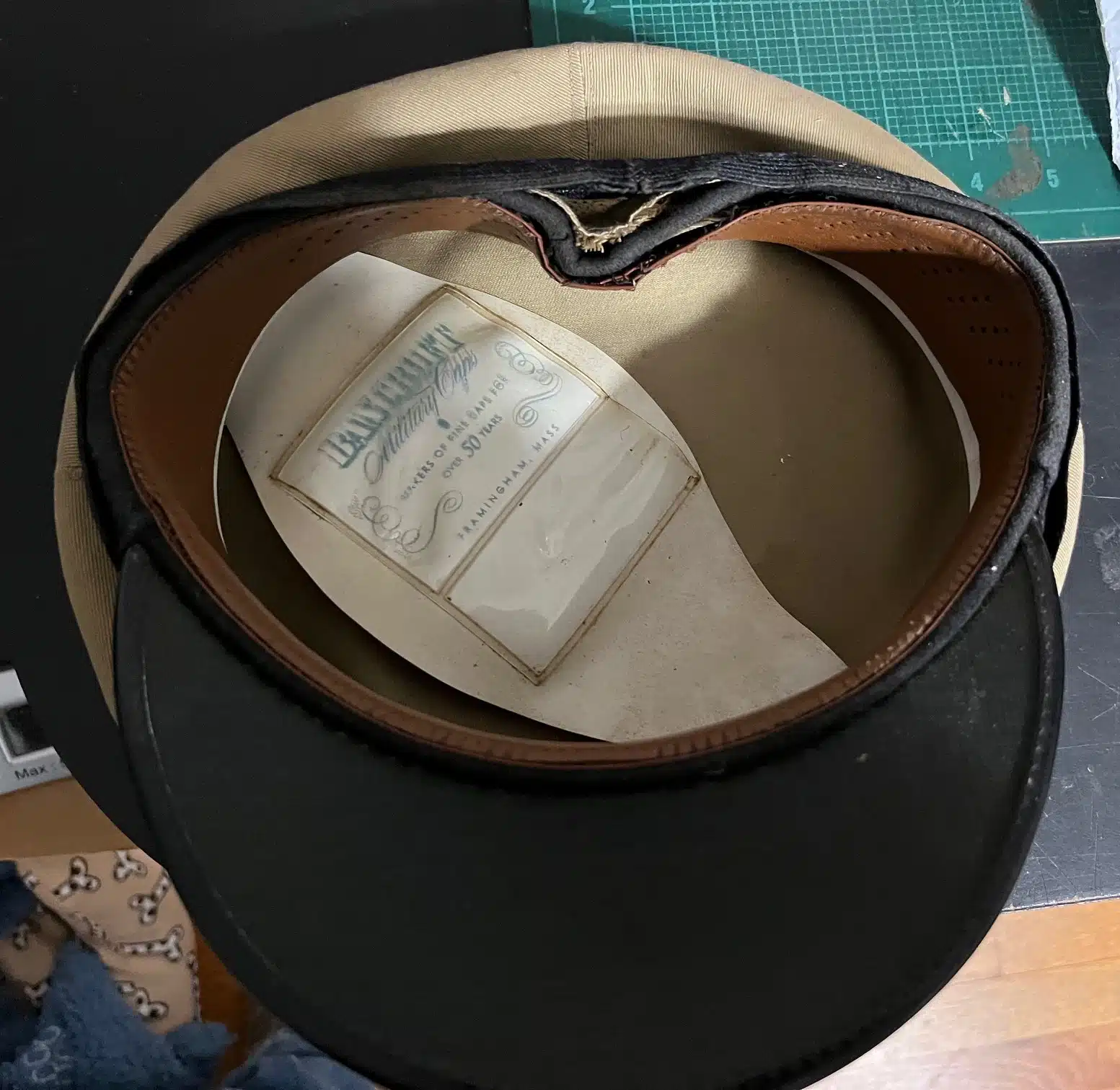 23252s. U. S. Navy / Coast Guard Khaki Enlisted / Officer hat. c. 1940’s. Without hat insignia or buttons or chin strap. Hat by Bancroft Military Hats, Framingham, Mass. Size not indicated. Moderate wear, some soiling. Includes the two brass studs to receive buttons to hold chin strap. (G+). $15.