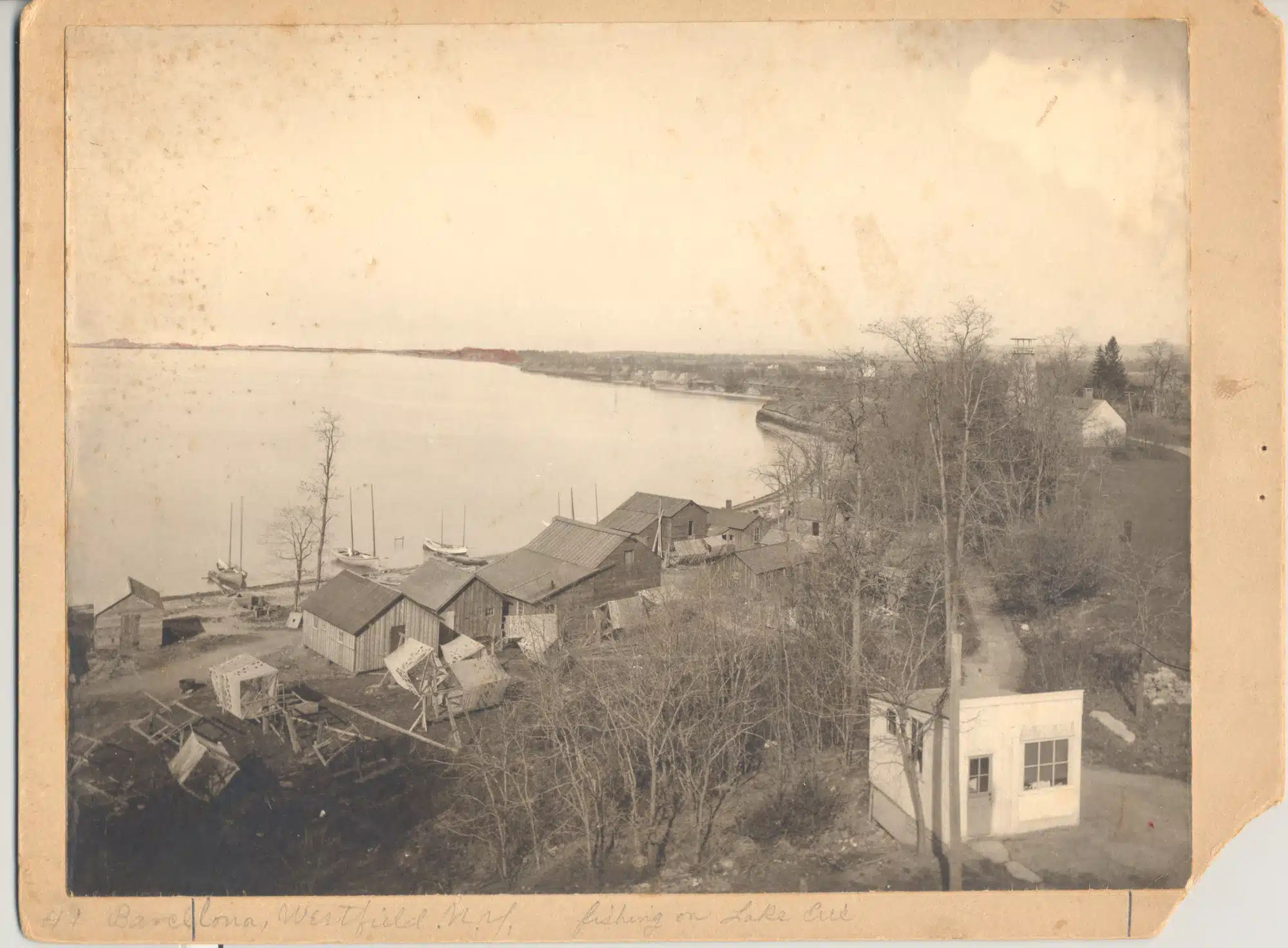 1. (cabinet photo) Barcelona NY Lighthouse and Harbor View c.1900. Large 7 ½” x 9 ¾” cabinet photo provides a wide view of the lakefront in Barcelona on Lake Erie including the lighthouse and keeper’s house. Clear close view. One 1” chip on mount to lower corner. (VG). $32.