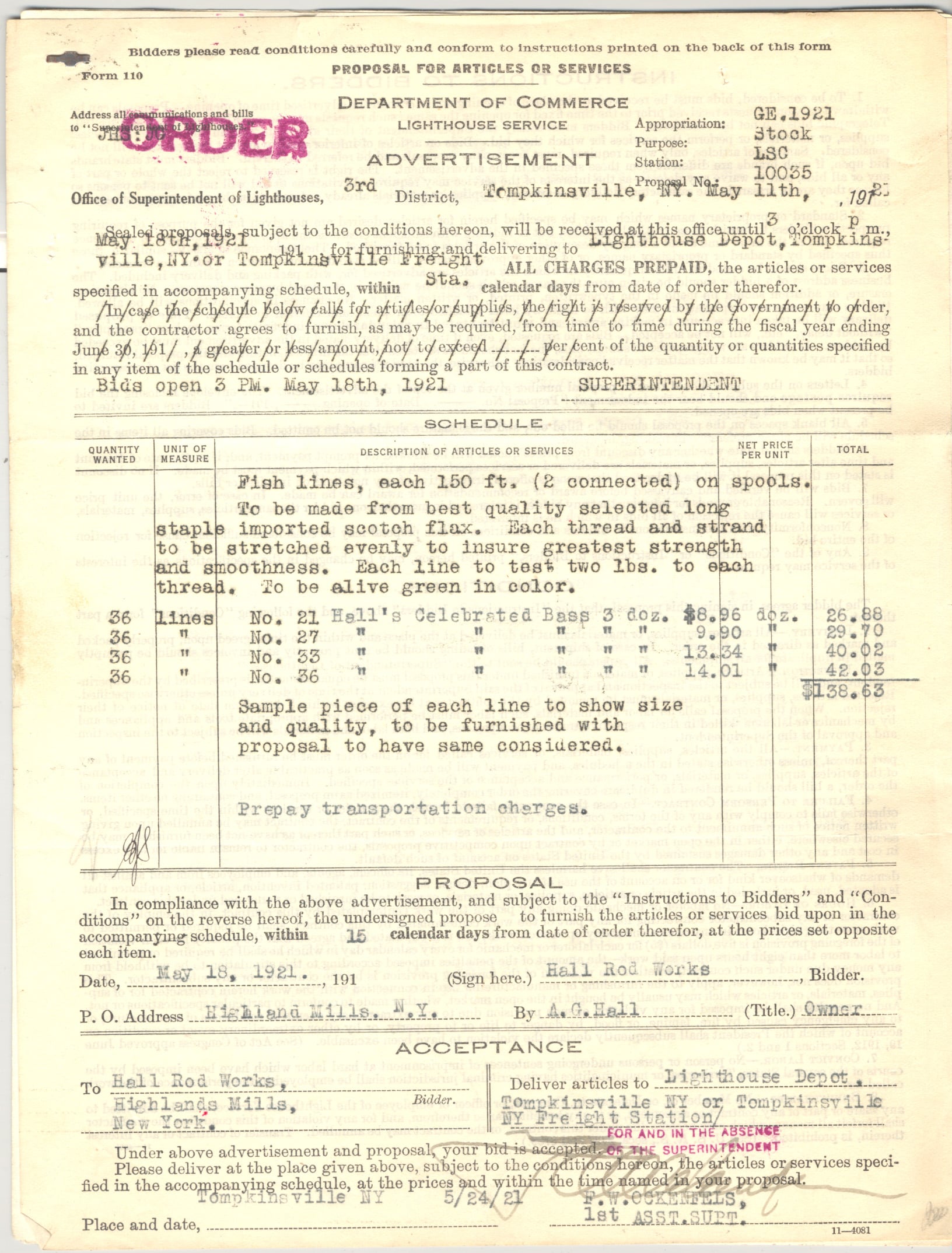 25330. (document) U. S. Lighthouse Service, Superintendent of Lighthouses, 3rd District, Thompkinsville Lighthouse Depot, New York. May 11, 1921. 4p. Original proposal / order signed by F. W. Ockenfels, 1st Assistant Superintendent, requests 144 fishing lines, 150 feet in length , from the Hall Rod Works in Highland Mills, New York. Typed LHS form No. 110 includes complete specifications for same. Nice example of early Lighthouse Service documentation. Only light use. (VG). $64.