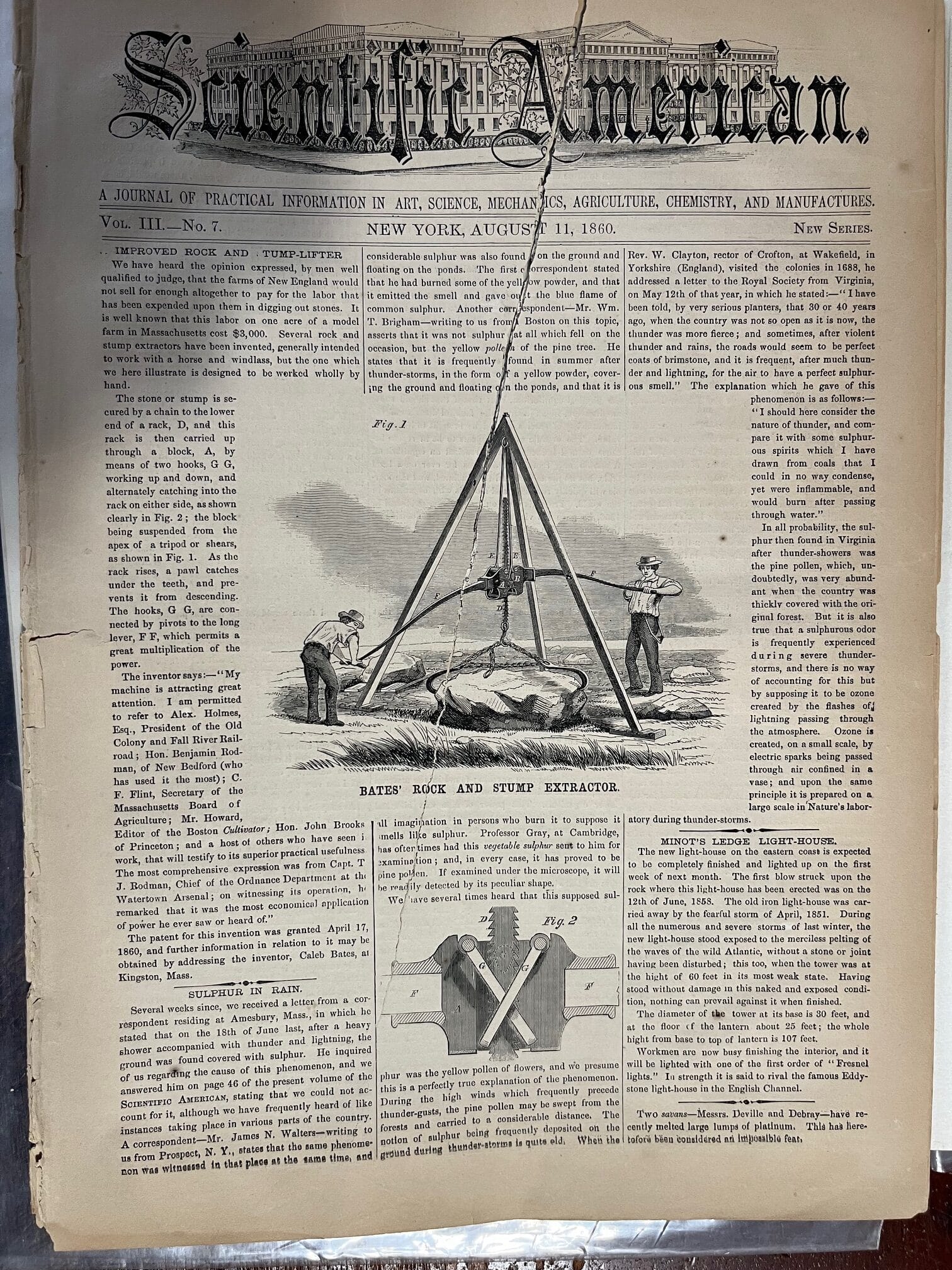 1. Minot’s Ledge Light House. Scientific American. August 11, 1860. Short front page article notes that the new light house on Minot’s Ledge is expected to be completed and lit next month. Some details of the excavation and construction are provided, as well as mention of the new first order lens to be installed. Full issue with numerous interesting articles of the day. Split down center from age but complete. (G). $20.