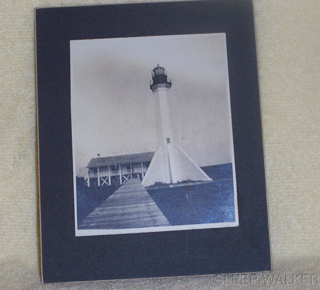 - (photo on mat) Sabine Pass Lighthouse, Louisiana. c.1920’s. The Sabine Pass Lighthouse was constructed in 1856 on a mud flat only 3 feet above high tide. It was constructed of brick and, because of the soft surface, has eight concrete buttresses to give it stability. There are four long buttresses, which extend 20 feet from the base and four smaller buttresses that extend about 18 feet from the outside wall. The tower has an octagonal shape and a height of 75 feet. The wall, at the base of the tower is one foot thick with an inside diameter of eight feet. The lighthouse was originally painted white but in the late 1930s, it was painted white with black stripes, which through the years have faded to a gray. The original lens was a third order Fresnel lens, which has long since been removed. The keepers quarters burned in 1976. The station was deactivated in 1952 and ownership transferred to the State of Louisiana. Today the property is owned by the Cameron Preservation Alliance – Sabine Pass Lighthouse, Inc. and efforts are underway to preserve the lighthouse structure. B/w image is clear and close and measures 3 ½” x 4 ½” and is mounted on a 5 ¼” x 6 ½” mat. Nice clear, close view of the pre 1930 light tower and elevated keeper’s dwelling. (VG+). $38.