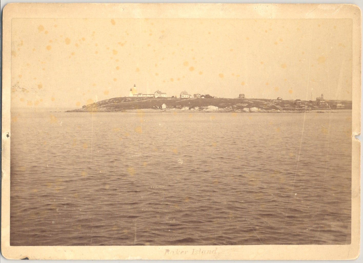 28242k. (cabinet photo) Bakers Island Lighthouses, Massachusetts. c.1893. Fine early view of the remote twin towers and keeper’s dwelling. Provides a rare, detailed view of this rarely seen offshore station. From a lot of lighthouse cabinet views dated 1893, this professional view measures 5” x 7” and is fairly clean and clear, light foxing, with good detail despite the distance. (VG). $48.