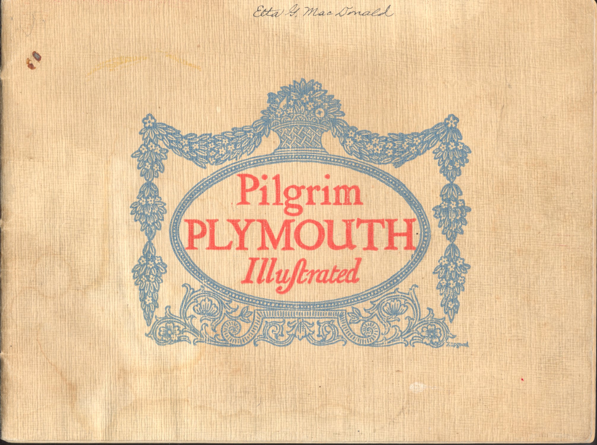 - [view book] PILGRIM PLYMOUTH ILLUSTRATED. A. S. Burbank, Plymouth, Mass. 1900. 30p. This scarce turn of the century view book of Plymouth features more than 30 beautiful photo-gravures of local views. 5” x 7” views include Plymouth Rock, the Mayflower, Old Fort and First Meeting House 1621, Town Square, graveyard, statues, Pilgrim Hall, Mayflower Relics, Standish House, Court Street, Along the Wharves, The Gurnet, Clarks Island, The Harlow House, North Street, Morton Park, Boot Pond, and more. Quite nice views, scarce booklet. Signature bound. Light to moderate soiling, light wear. Scarce. (VG-). $34.