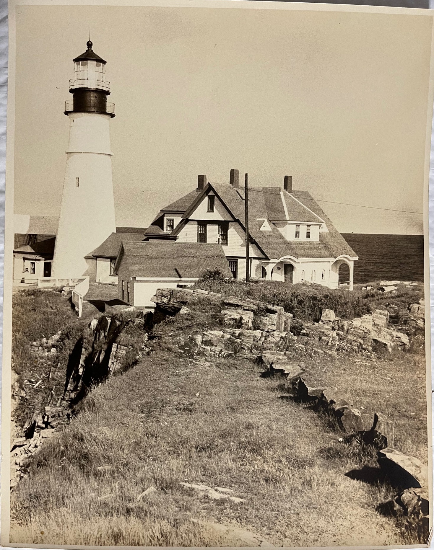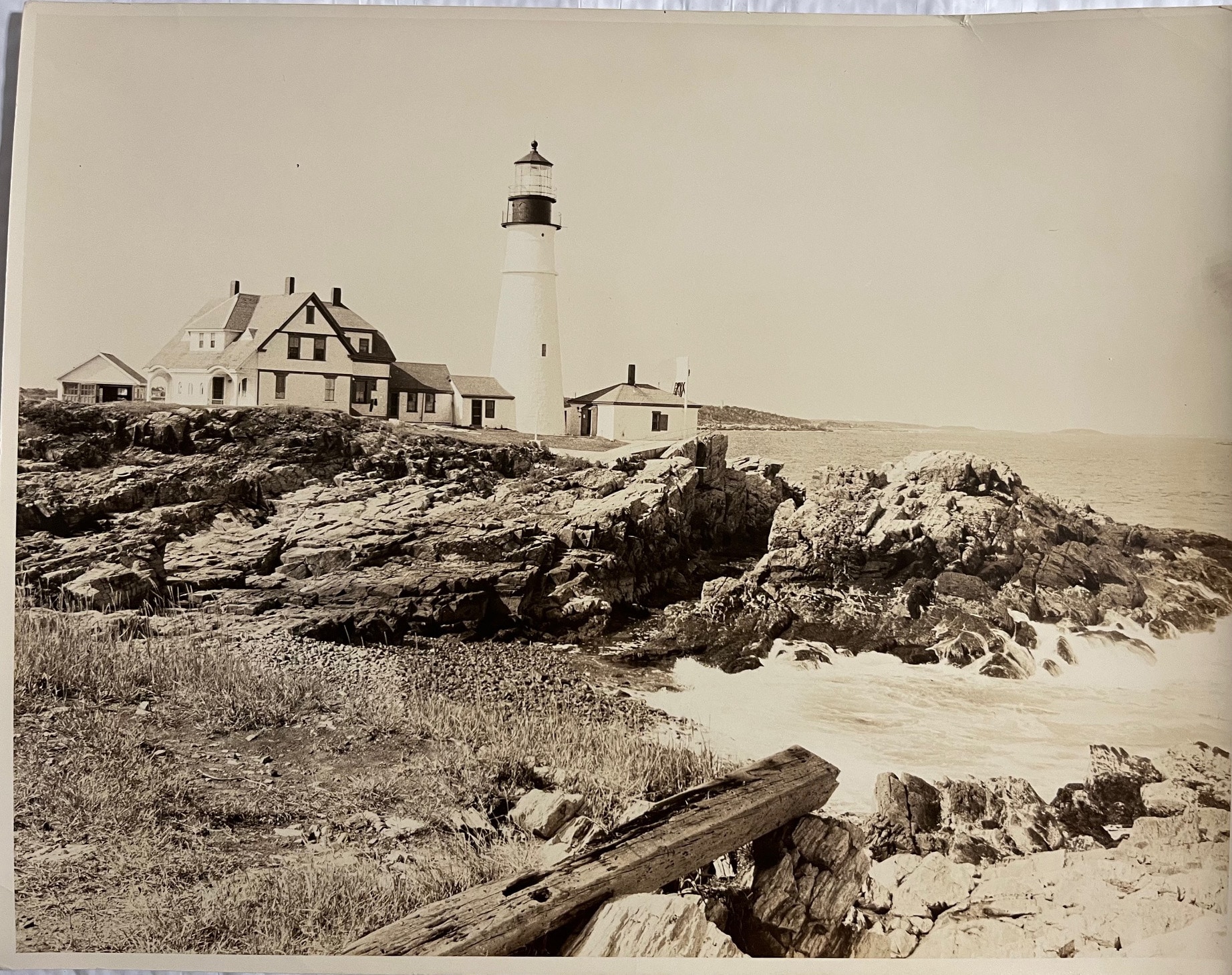 2847a. (photograph) Portland Head Lighthouse, Maine c.1950-1970. Lovely large 11” x 14” professional b/w sepia photograph provides a wonderful clear, close view of the entire light station from the rocky shore on the south side. Great detail includes the tall light tower, 2-story keeper’s dwelling, fog signal building, garage and more. Exquisite piece for framing. (VG+). $24.