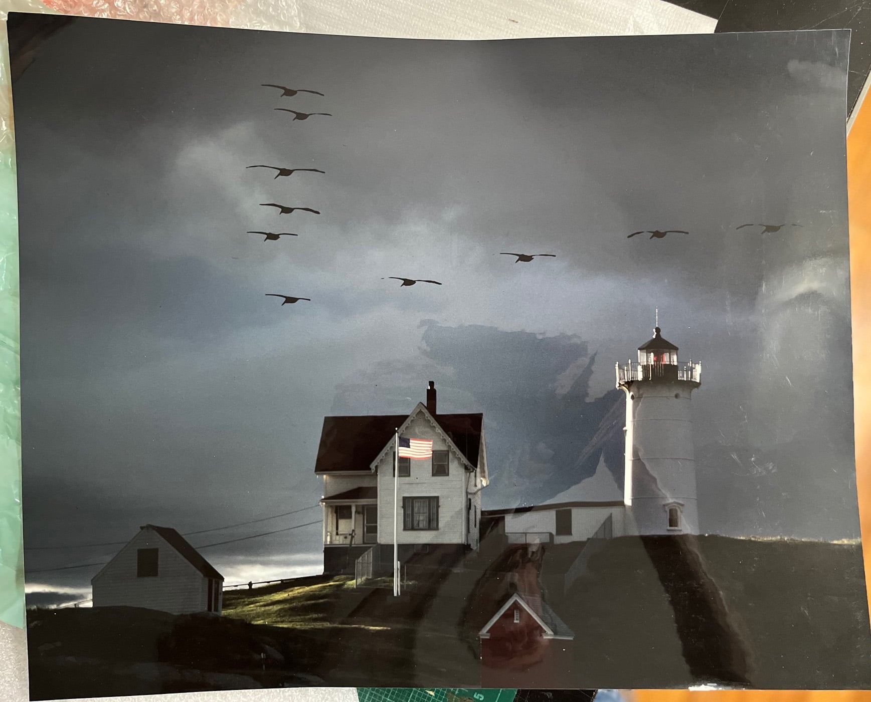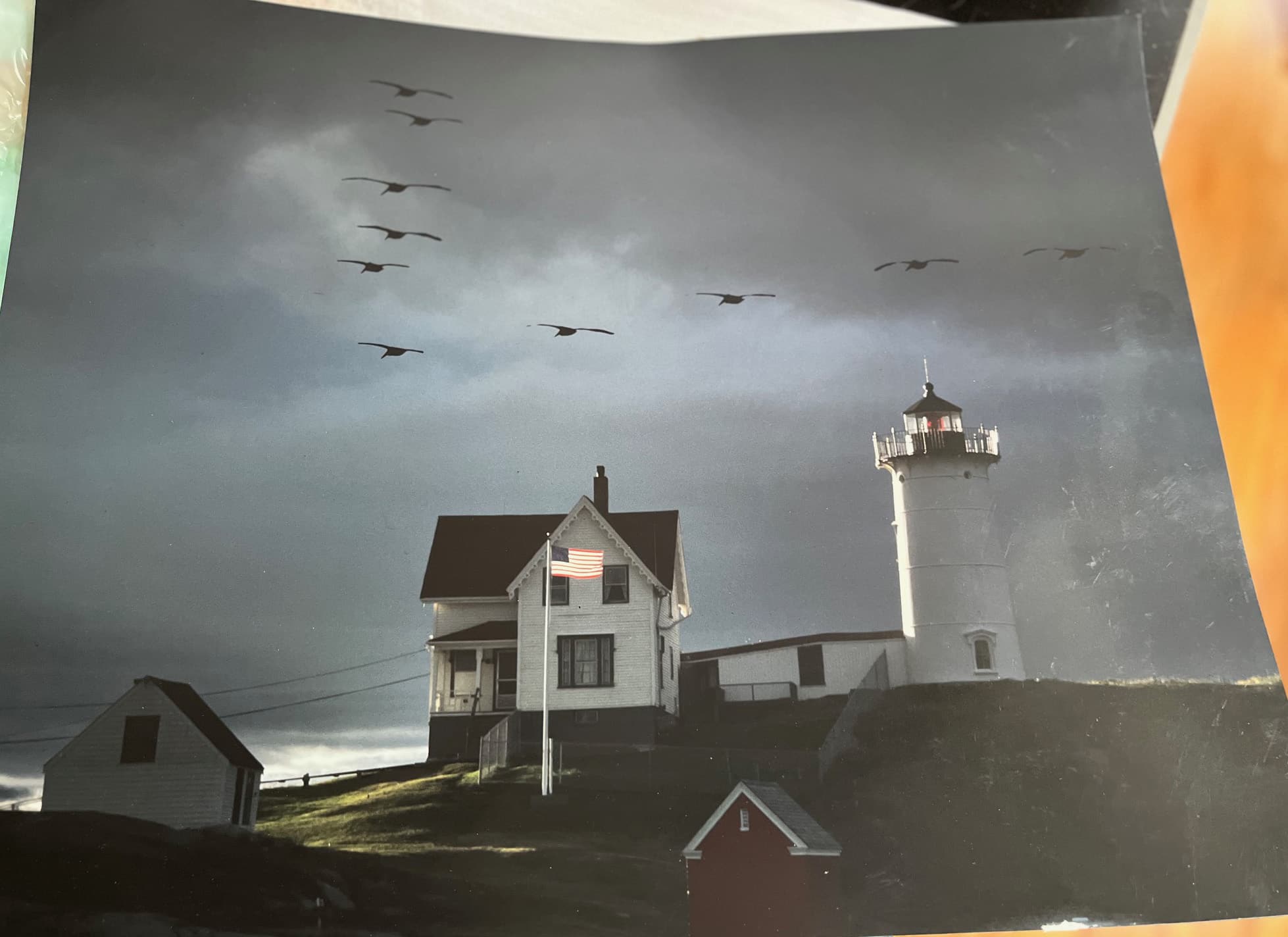 - (photograph) “Dawn at the Lighthouse” – Nubble Lighthouse, Cape Neddick, Maine c.1980. Striking, large color photograph by professional photographer Edward J. Kazmirski of South Holland, Illinois, captures beautifully Maine’s rocky coastline with a fine view of Nubble Lighthouse perched on the rocky point as gulls fly overhead. Taken as a storm approached, the lighting is magnificent! This photo includes the cast iron light tower and attached keeper’s dwellin, as well as the boat house and oil house. Unusually large, the photo measures 16” x 20” and is printed on a fine gloss paper. This photo was a winner at a number of shows for the photographer. Clear and close, will be wonderful framed for your wall no matter where you live. Rare image. (VG+). $138.