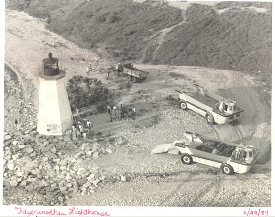 31058. (photo) Fayerweather Island (Black Rock Harbor) Connecticut Lighthouse Repaired c.1984. Clear, close, original 7” x 9” press photo shows excellent detail of the weathered Fayerweather Island Lighthouse built in 1823 to replace an earlier light, to mark the entrance into Bridgeport, Connecticut’s harbor. The photo was taken in 1984 as the U.S. Army Reserve and others work to restore the deteriorating structure. Photo is b/w and is dated June 1984. Includes the photo as a newspaper image. Clear, close, nice detailed view. Light soiling. (VG+). $36.