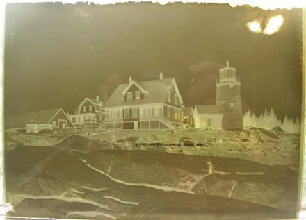 32066. (glass plate negative) White Head Lighthouse, Maine c.1890-1900. Original Large Format 5” x 7″ antique glass plate negative shows marvelous detail of a light station at White Head on the rocky Maine coast. Rare close view would make wonderful prints. (VG). $45.