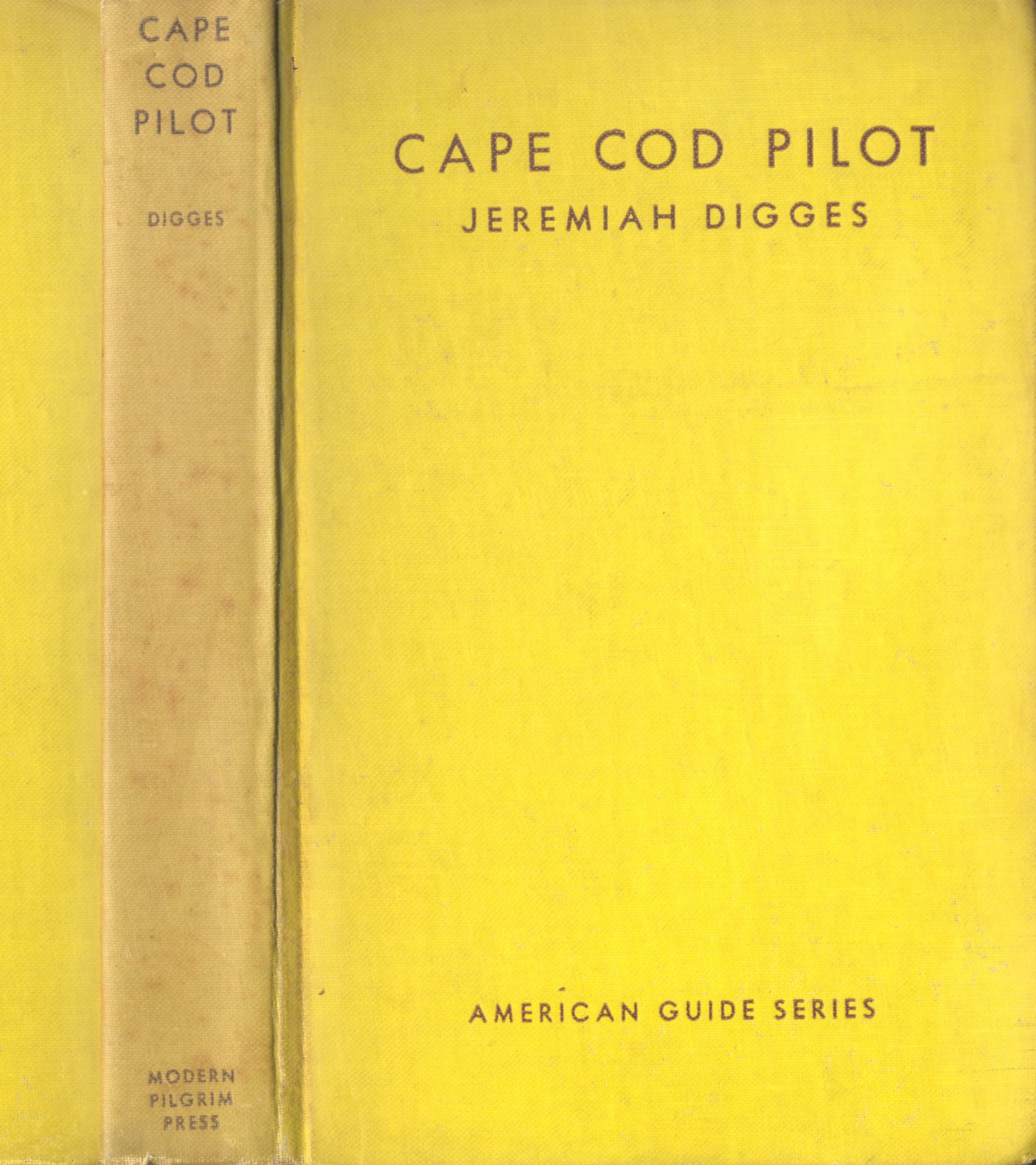 - Diggs, Jeremiah. Cape Cod Pilot. Federal Writers Project W.P.A. Modern Pilgrim Press. 1937. 404p. Stiff wraps. Yellow cloth with brown lettering on the front board and spine. Illustrated endpapers and pastedowns. Illustrated with eight double-sided plates of black and white photographs. Federal Writer’s Project, Works Project Administration for the State of Massachusetts. Part of the American Guide Series. This volume sponsored by Poor Richard Associates. One of the American Guide Series, and if only they were all as good, or half as good…. Favorably reviewed in various directions, this deserves wider attention. Delightfully and breezily written, a good handbook and good armchair reading as well, this book has the salty tang of the Cape itself, and the feel of its traditions, and is a pathfinder to its surviving charms. Good American background material. A wonderful read. Some edge wear, soiling to wraps and spine. Contents clean, tight, very good. (VG). $20.