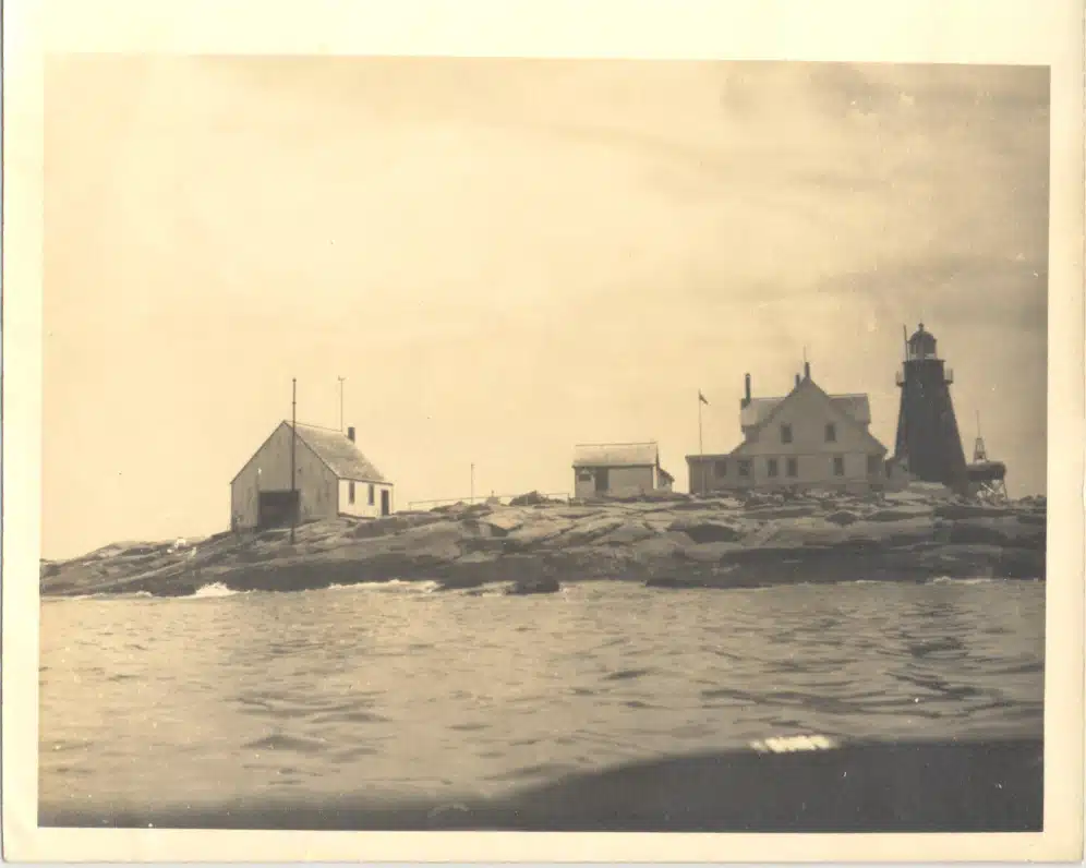 - (photo) Mount Desert Rock Lighthouse, Maine c.1900+. Nice small print of the Mount Desert Rock lighthouse depicts the keepers’ house and out buildings at this remote Maine island lighthouse. Mount Desert Rock is one of the most isolated and desolate places ever used as a site for a lighthouse in the United States. The lighthouse lies on a dangerous granite ledge lying twenty eight miles from the nearest mainland. Storms fairly sweep over the six acre rock and at times nearly swept the keeper’s house away. Photo depicts the 1850’s granite lighthouse as well as the 45-foot bell tower and duplex keepers’ dwelling, boathouse and more. Photo measures 4” x 5” and is clean and clear. (VG+). $8.