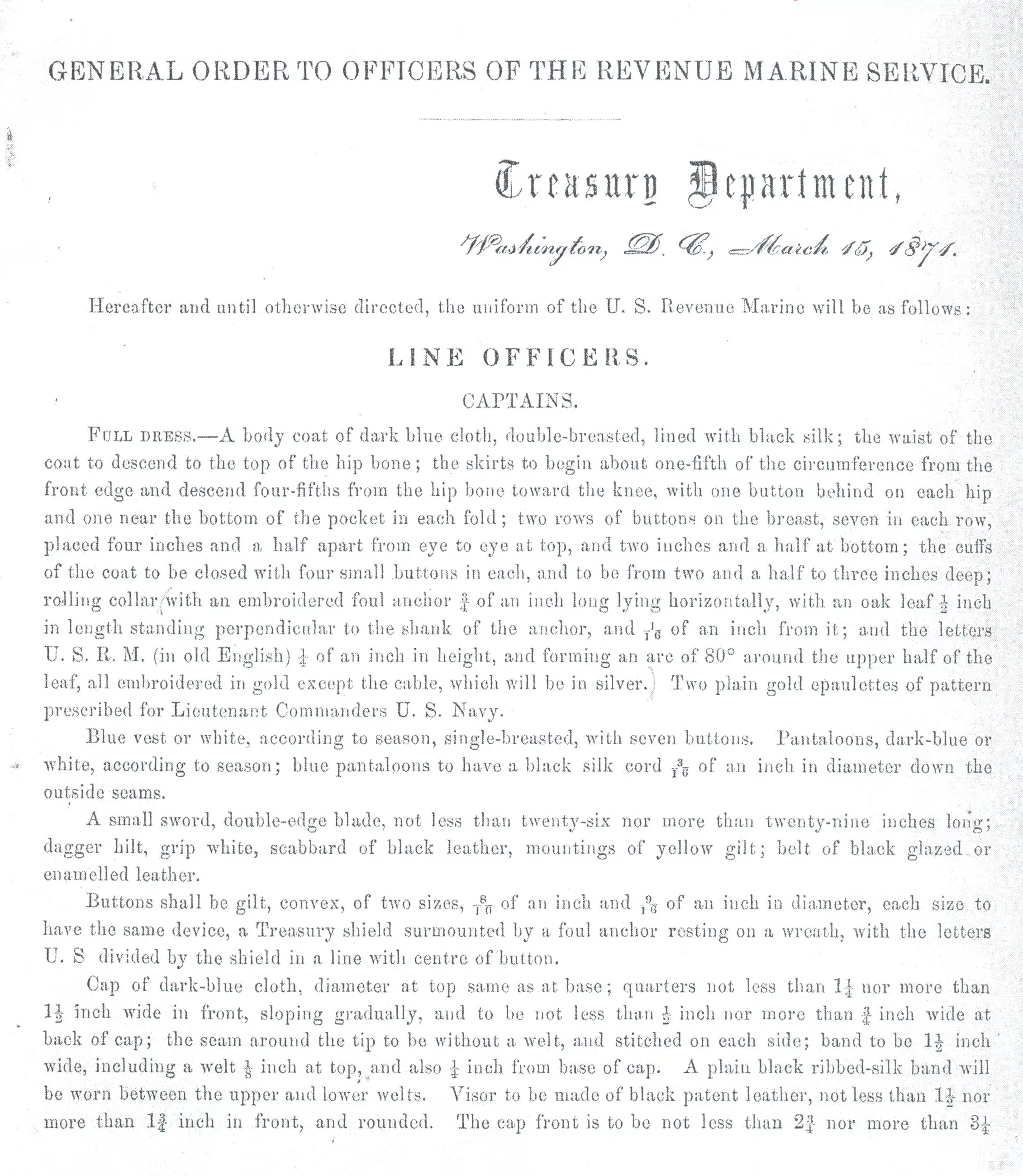 33164. (copy) U.S. Revenue Marine Service. General Orders Regarding Uniforms of Officers and Crew. March 15, 1871.