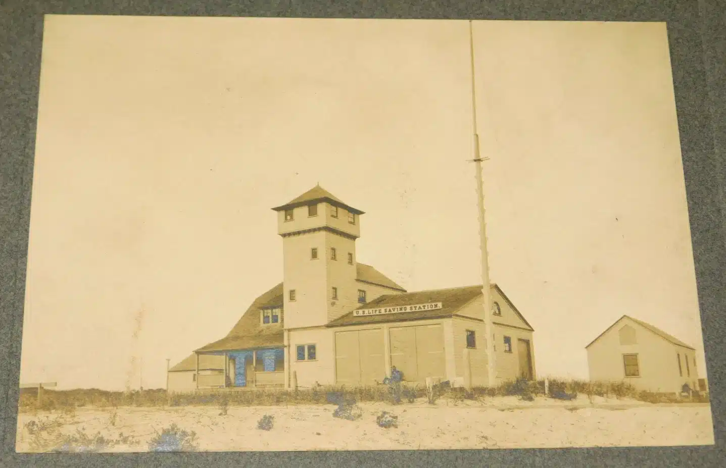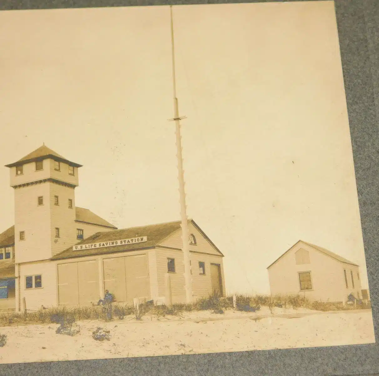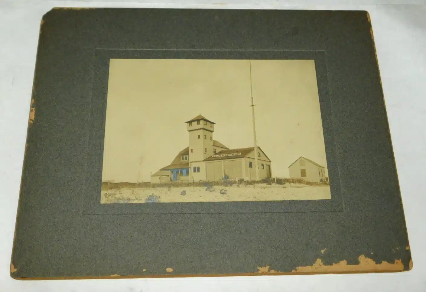 - (mounted photo) Old Harbor Life-Saving Station, Chatham c.1900. The Old Harbor Life-Saving Station was built in 1897 and placed in commission in 1898 on a site “north one-half mile of Chatham Inlet.” It was originally referred to as the Chatham Old Harbor station. The station was of the Duluth-type with a prominent lookout tower to survey Cape Cod shipping. The station received some improvements in 1910, probably to make it more capable to operate the motorized life-boat. Old Harbor station is listed in 1940, but not in 1945. The records show the property was abandoned in 1947. Old Harbor Station was removed from the site in 1977 and moved north to Race Point on Cape Cod. Today the station has been restored as an exhibit on the Cape Cod National Seashore and is maintained by the U.S. Park Service. Photo measures 4 ¼” x 6” on 8” x 10” grey mount and is clear and fairly close, providing an exceptional view of the station and out-building. Image near fine, mount with some wear and loss to edges. Rare view. (VG). $44.