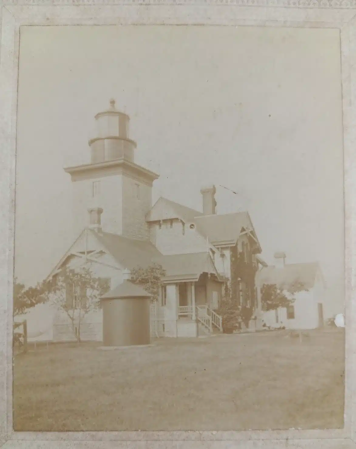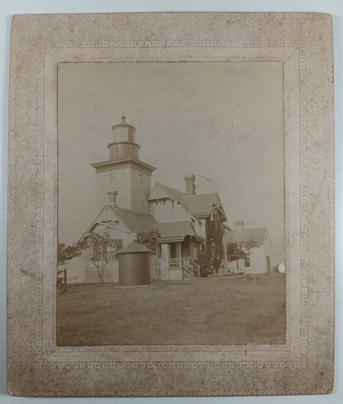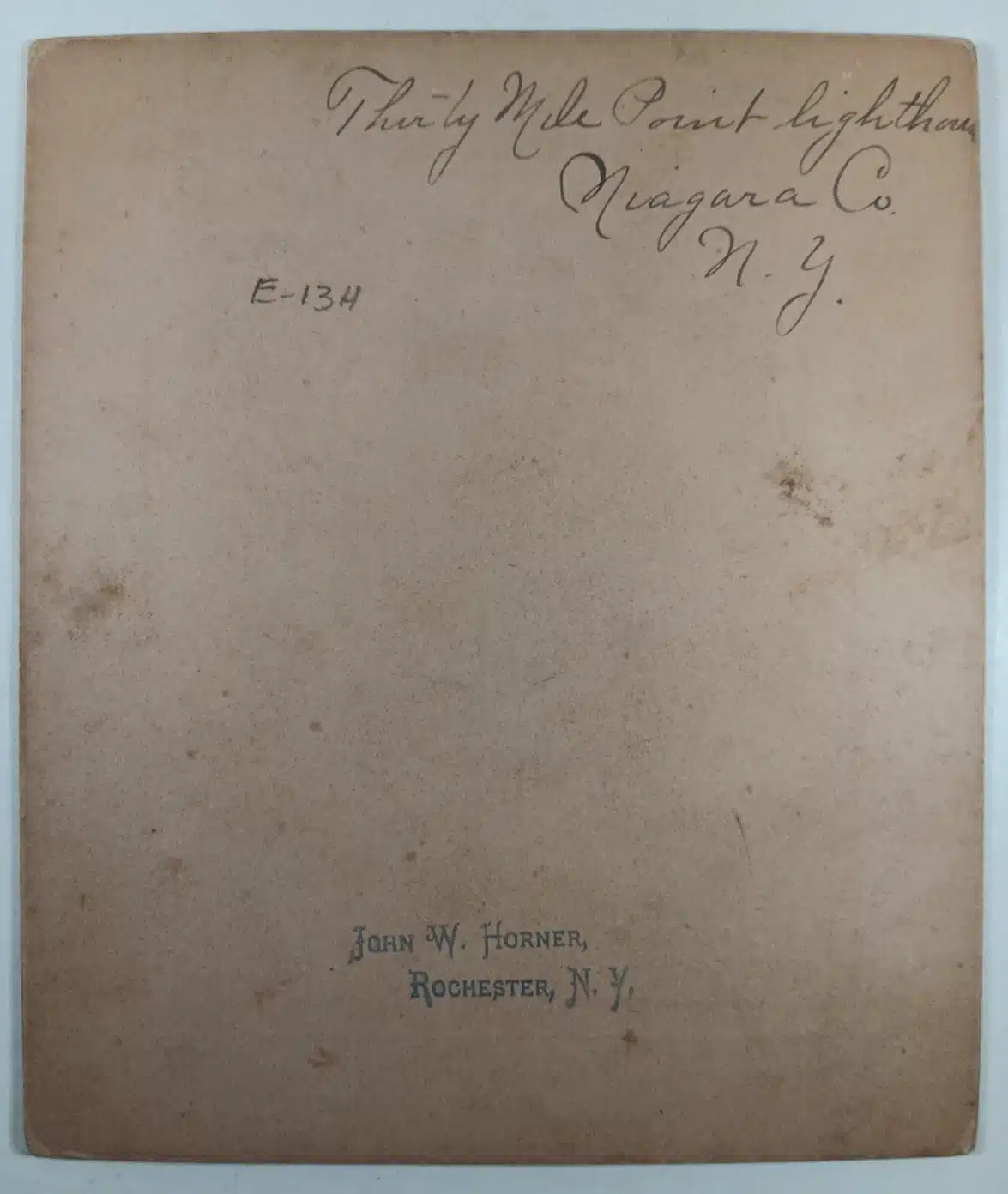 - (mounted photo) Thirty Mile Point Lighthouse – Niagara Co. N.Y. by John W. Horner of Rochester, N.Y. Close, clear view shows great detail of this landmark light station on Lake Ontario. A greatly detailed view, clear, quite good condition. Measures 3 ¾” x 4 ¾” on 5 ½” x 6 ½” mount. Even today, Thirty Mile Point Lighthouse is quite isolated, being some distance from any major port or city. This is because the lighthouse wasn’t built to guide mariners to a safe harbor, but rather as a coastal light, warning mariners of shoals and guiding them along this portion of Lake Ontario. The two-story, seven-room dwelling and attached seventy-foot-tall, square tower were built in a High Victorian Gothic style using natural faced limestone blocks. The light from the tower’s six-panel, third-order Fresnel lens, which cost just over $3,000 and was manufactured in France by L. Sautter and Company, was first exhibited on April 27, 1876. New York State began acquiring acreage around the lighthouse in the 1950s, and in 1962, 378-acre Golden Hill State Park was created. The lighthouse was transferred from the Coast Guard to the New York State Office of Parks, Recreation, and Historic Preservation in 1984. Believe to be a rare view of this charming light station. Some foxing and browning of mount, light wear. Labeled on back with photographer’s stamp. (VG+). $48.