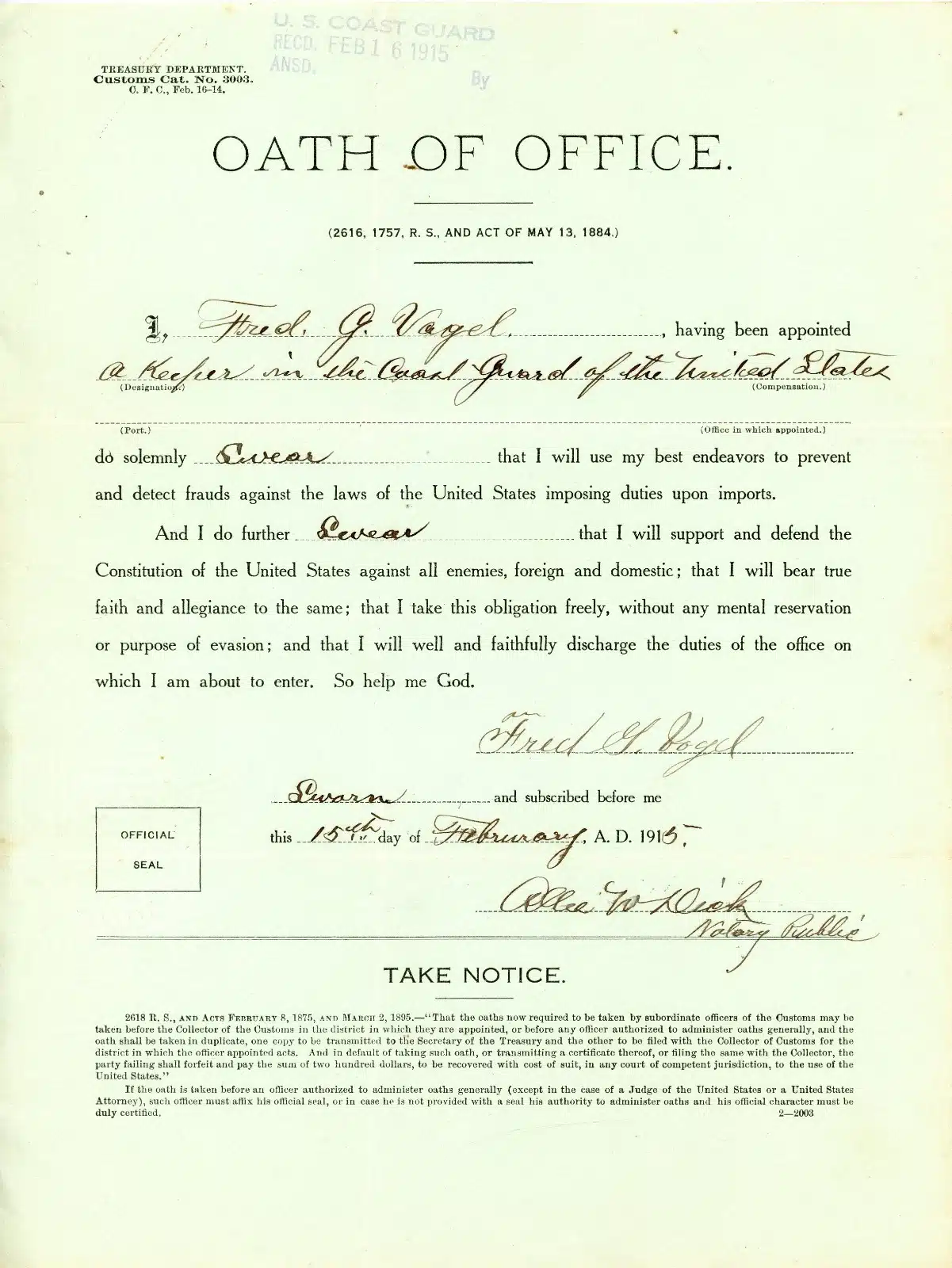 Oath of office signed with a raised official seal dated 15 Feb 1915.