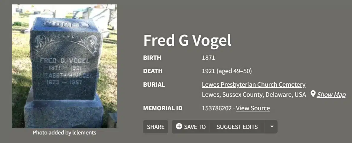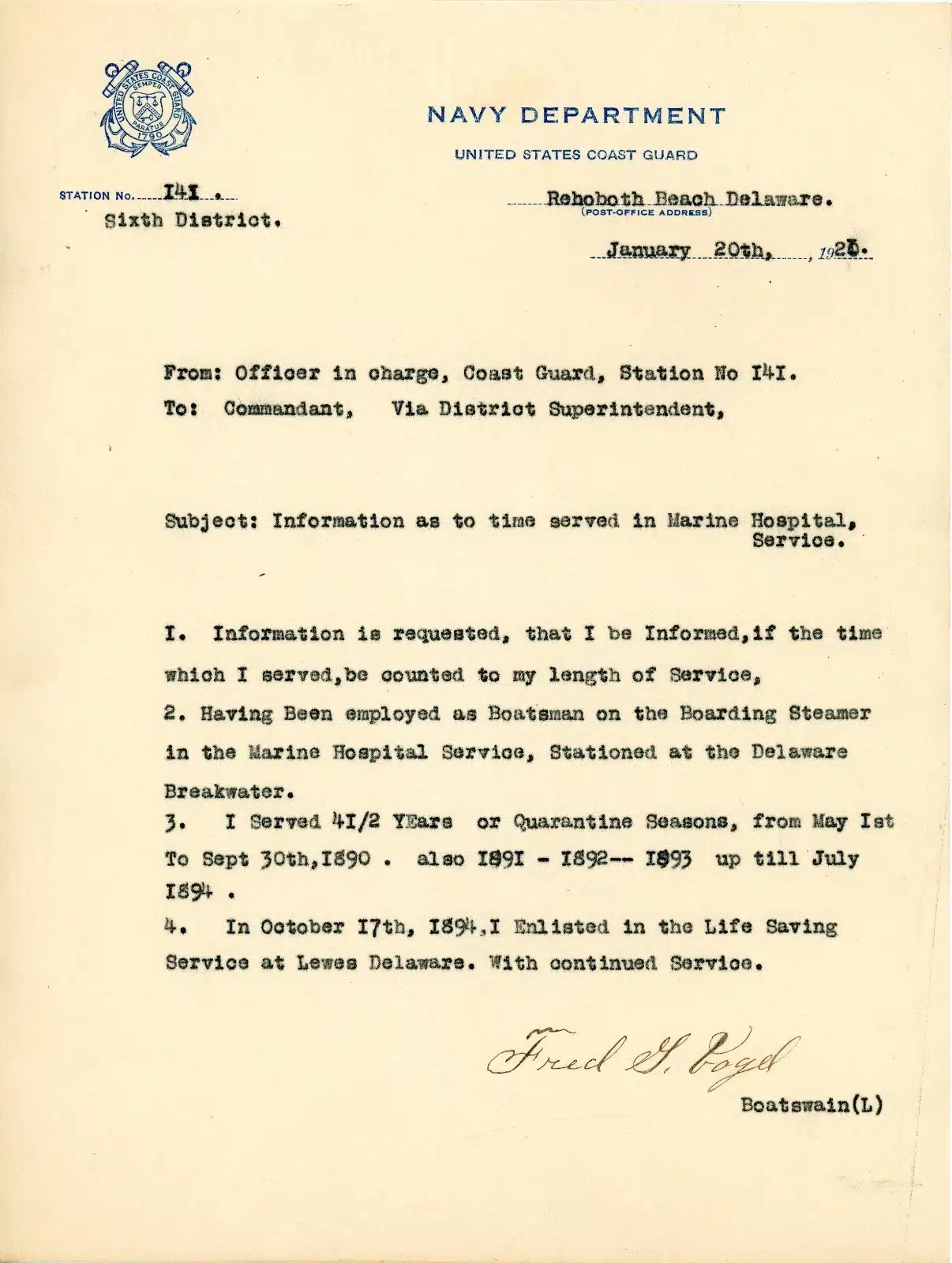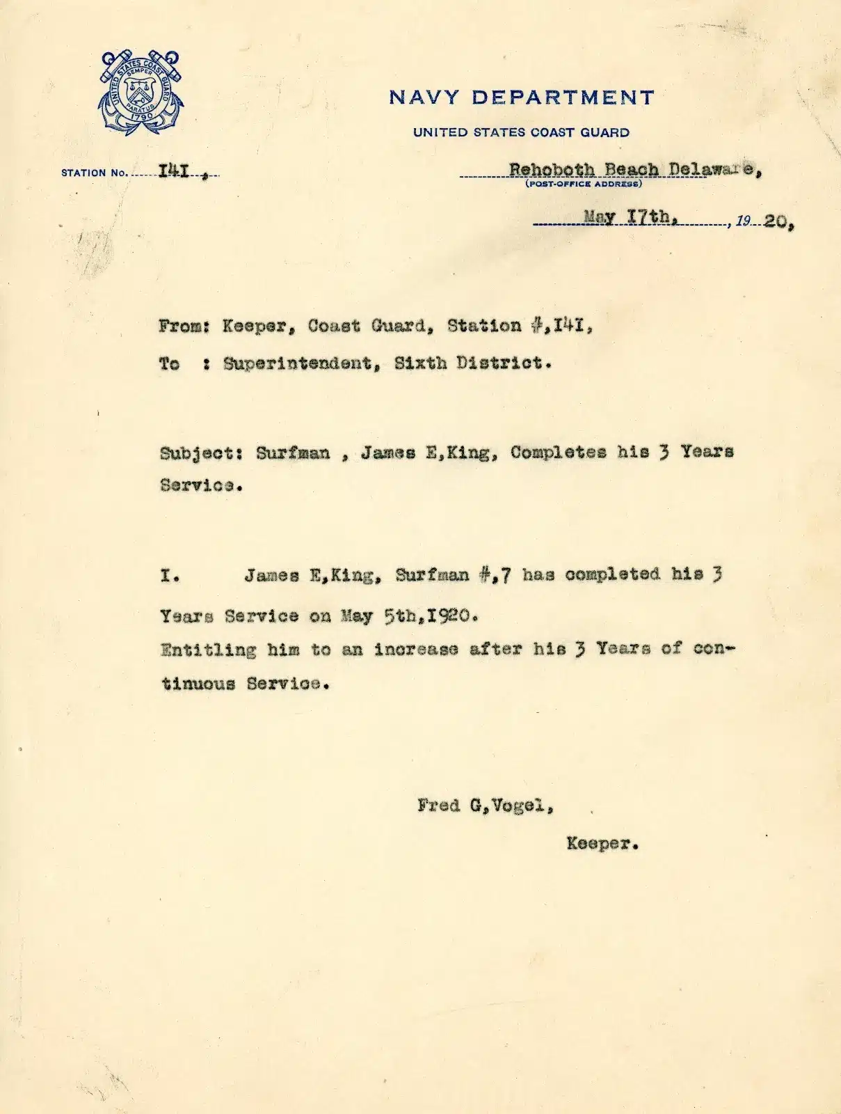 - (lot 5 documents) Fred G. Vogel (1871-1921) Coast Guard Keeper Station #141, Rehoboth Beach DE (1915-1921)