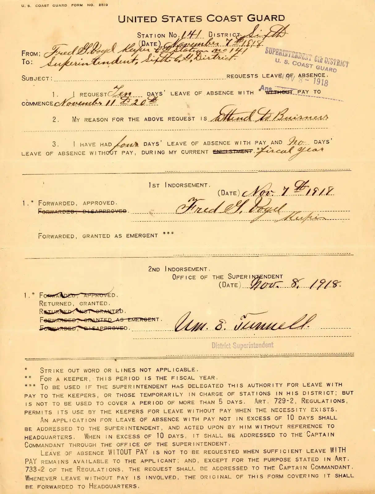 USCG Request for Leave to Superintendent 6th District USCG dated 8 Nov 1918.