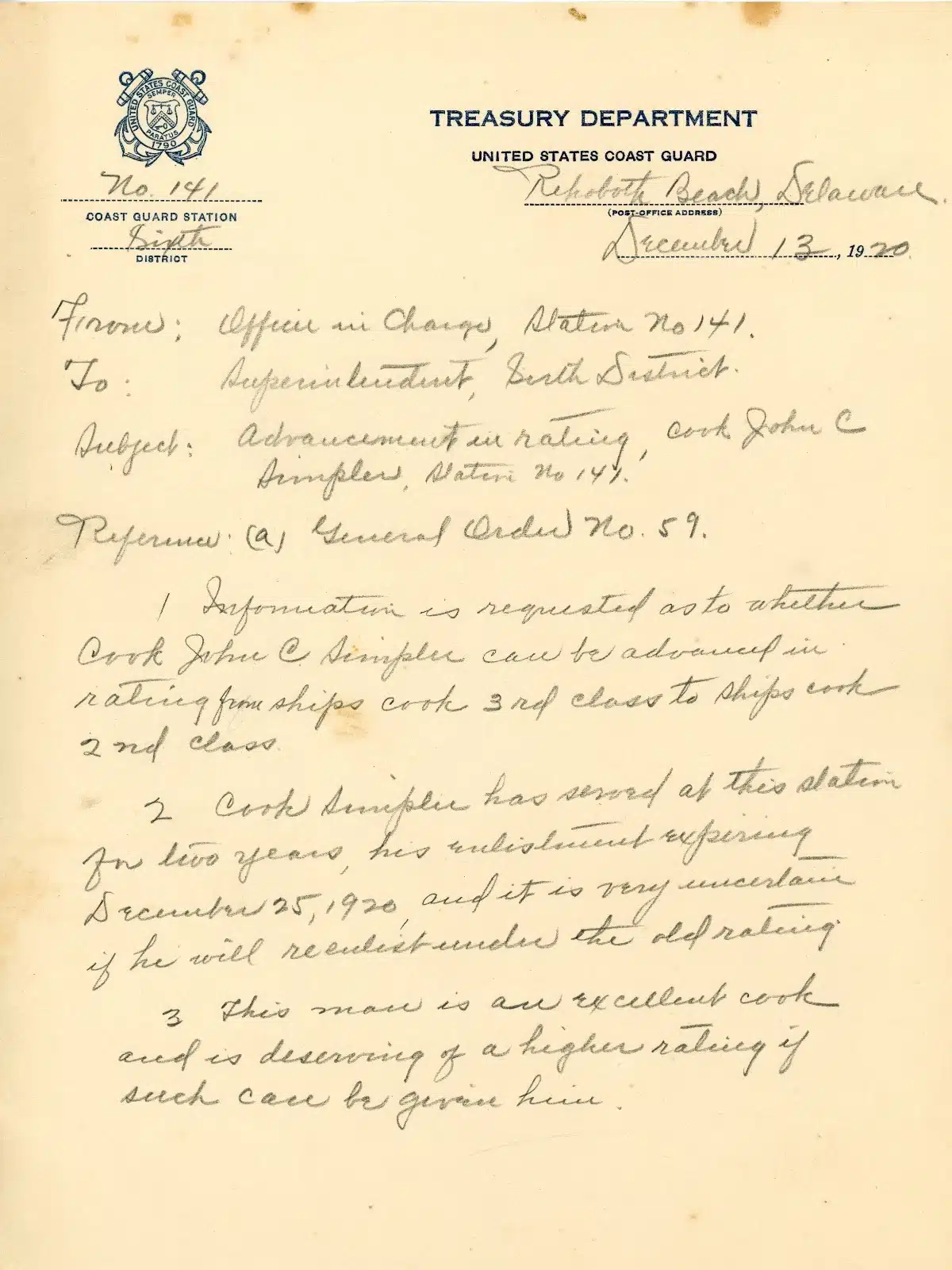 Correspondence recommending promotion for lighthouse cook dated 13 Dec 1920.