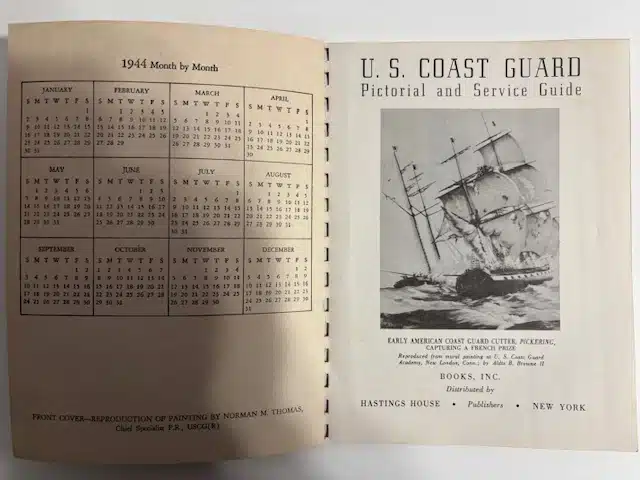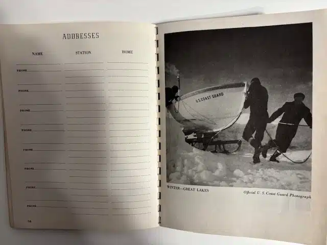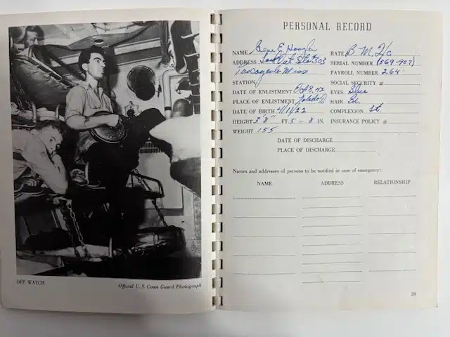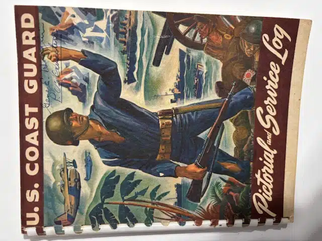 - na. U.S. Coast Guard Pictorial and Service Log. Hastings House, New York. 1944. 72p. Spiral bound. Filled out in part by BM2C Gene E. Hooglei, Lookout at CG Station No. 303 in Mississippi. Rare Coast Guard is filled with period Coast Guard photographs and details the history of the Service, locations, vessels, duties and more. Record pages allows space for including the owner’s personal record, medical record, pay accounts, promotions and citations, marksmanship, autographs, addresses and more. Filled out in part by 23 year old BM2C Hooglei. Overall clean, intact, light aging. Rare WWII era Coast Guard piece. (VG). $28.