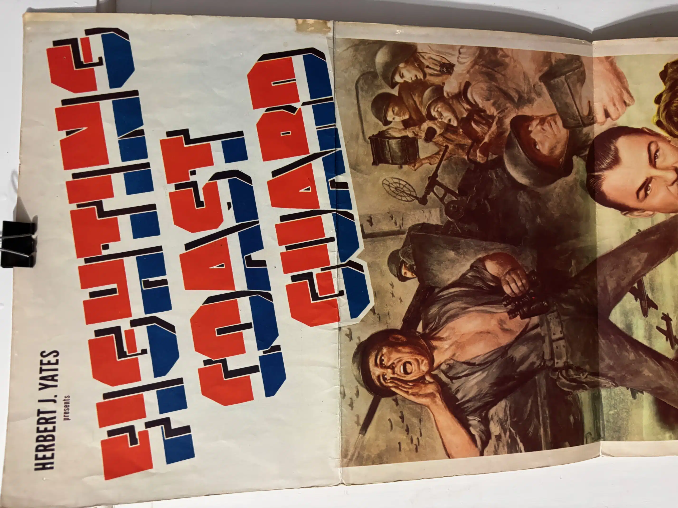 35007b. (movie theatre lobby poster) Fighting Coast Guard with Brian Donlevy, Forrest Tucker, Ella Raines. A Republic Picture. 1951. Marked USA 51-266. The film Fighting Coast Guard is a 1951 American adventure film directed by Joseph Kane. “The movie was released on June 1, 1951 and revolves around a crew chief who is tricked into volunteering for the Officer’s Training School after the Japanese sneak attack on Pearl Harbor. The film is set during World War II and showcases the training and experiences of the Coast Guard as they prepare to help win the war.” Rare original lobby vertical poster measures 14” x 36”and is in good used condition. Pin holes in corners from mounting, some edge wear, light soiling, light wear to folds but intact. This style is a rare piece. A great piece to frame. (G+). $58.