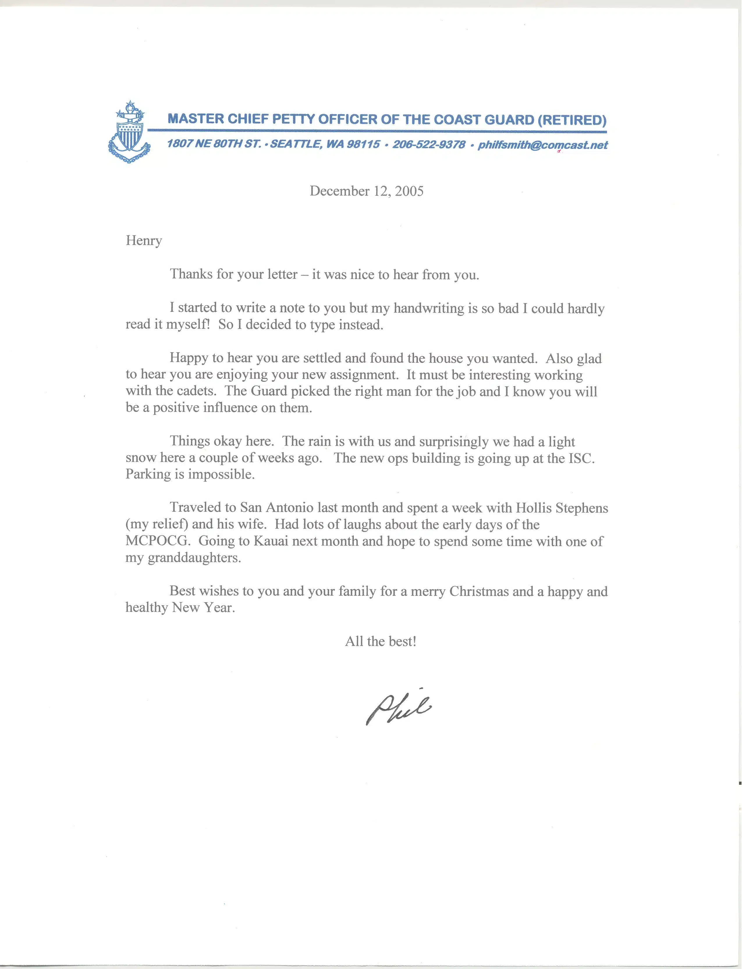 1. (stationery) Master Chief Petty Officer of the Coast Guard c.2005. Fine examples of stationery used by Master Chief Petty Officer of the Coast Guard (retired) Phil F. Smith in the form of a typed letter to a fellow Coast Guardsman. Dated 2005 and signed in hand. 8 ½” x 11”. (VG+) $10.