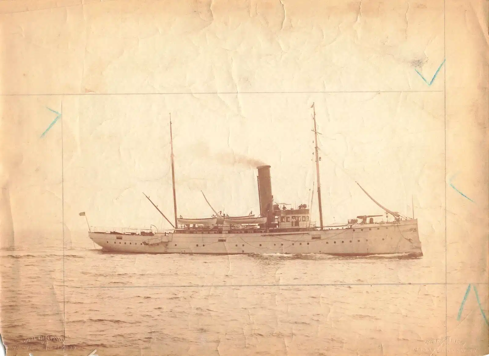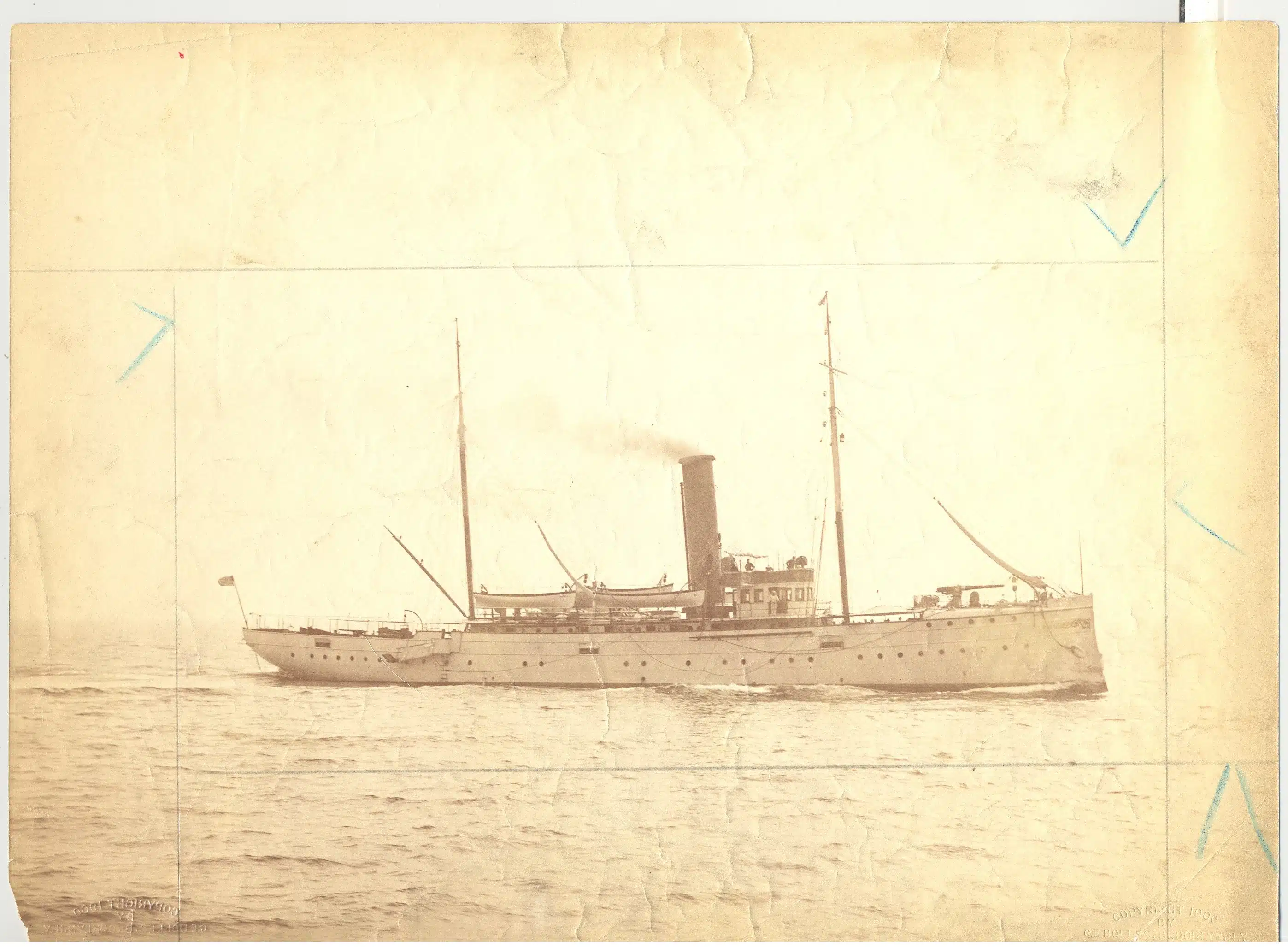 1. (photo) U.S. Revenue Cutter Gresham Great Lakes c.1900. 6 ¾” x 9 ¼” overall. USRC Gresham was a cruising cutter and auxiliary gunboat built for the Revenue Cutter Service to patrol the Great Lakes. She was one of a series of cutters named for former U.S. Secretaries of the Treasury. Her namesake Walter Q. Gresham served as the 35th Secretary of the Treasury in 1884. She became part of the newly created United States Coast Guard in 1915, and also served as a coastal convoy escort and patrol boat under United States Navy control during both World War I and World War II. She was decommissioned by the Coast Guard and sold in 1944. Good c.1900 clear, close view of the starboard side. Photo has a cropping box in pencil and some light soiling to margins. Great detail. (VG). $88.