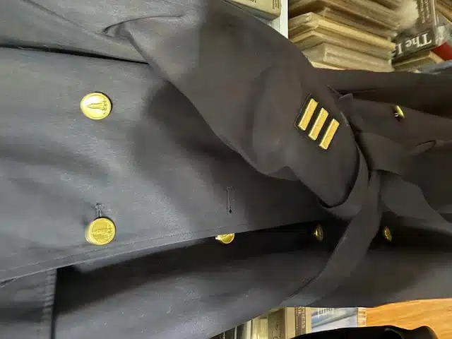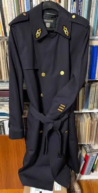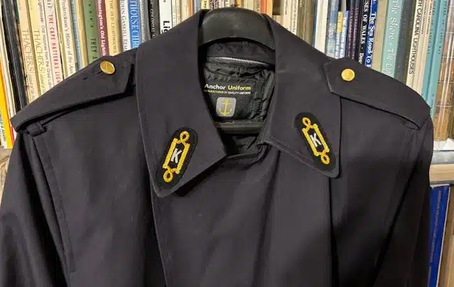 1. (reproduction overcoat) Lighthouse Keeper Overcoat. Size 42 L. With quilted zip-out liner. Complete with 8-button double breasted front, two “K” collar insignia, and three gold hash marks (15 years). In stock, ready for delivery. $397 plus postage.