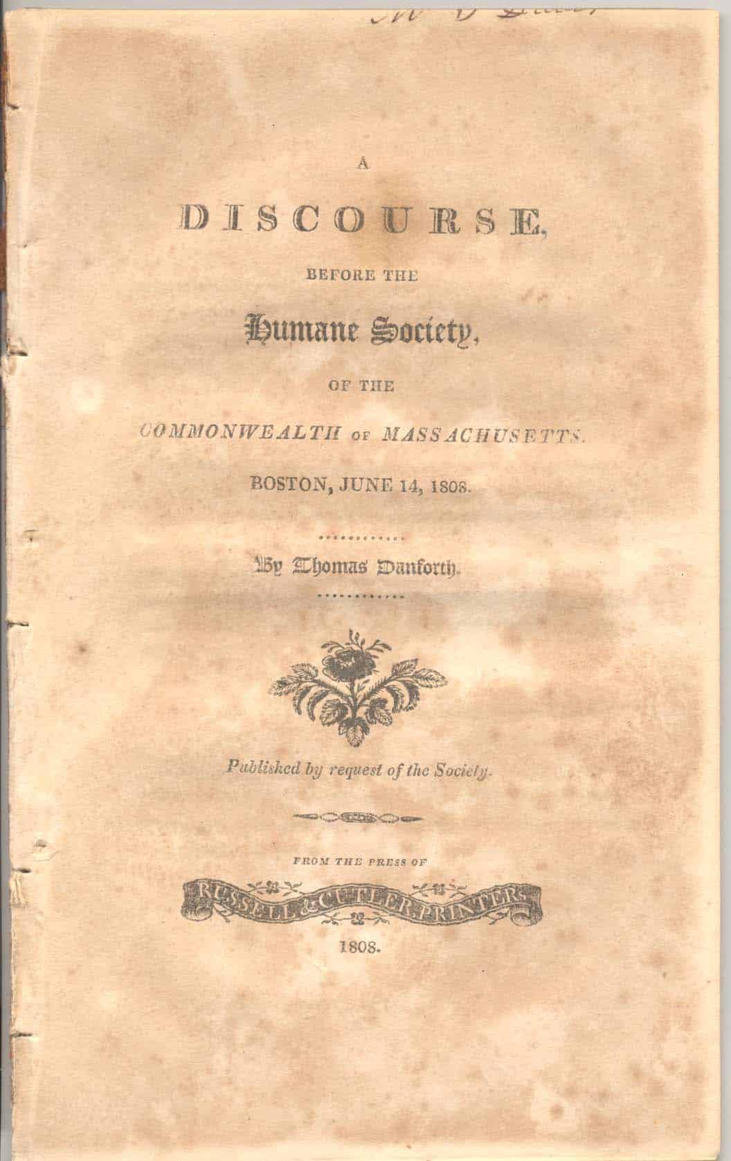 5393c. A DISCOURSE, BEFORE THE HUMANE SOCIETY, OF THE COMMONWEALTH OF MASSACHUSETTS . Thomas Danforth. Boston . June 14, 1808. 39pp. In addition to sermon, chronicles a number of rescues, property and expenses of the Society, premiums awarded as well as a listing of members and officers. Disbound. (G). $58.