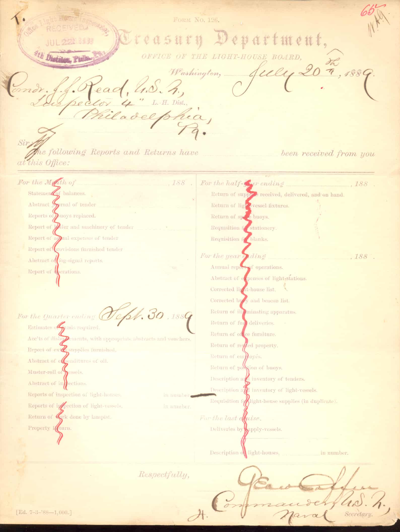 632. From George W. Coffin, Naval Secretary to Comdr. J.J. Reed, Inspector 4th. L. H. District, acknowledging receipt of report of inspection of lighthouses. Dated July 20, 1889. $16.