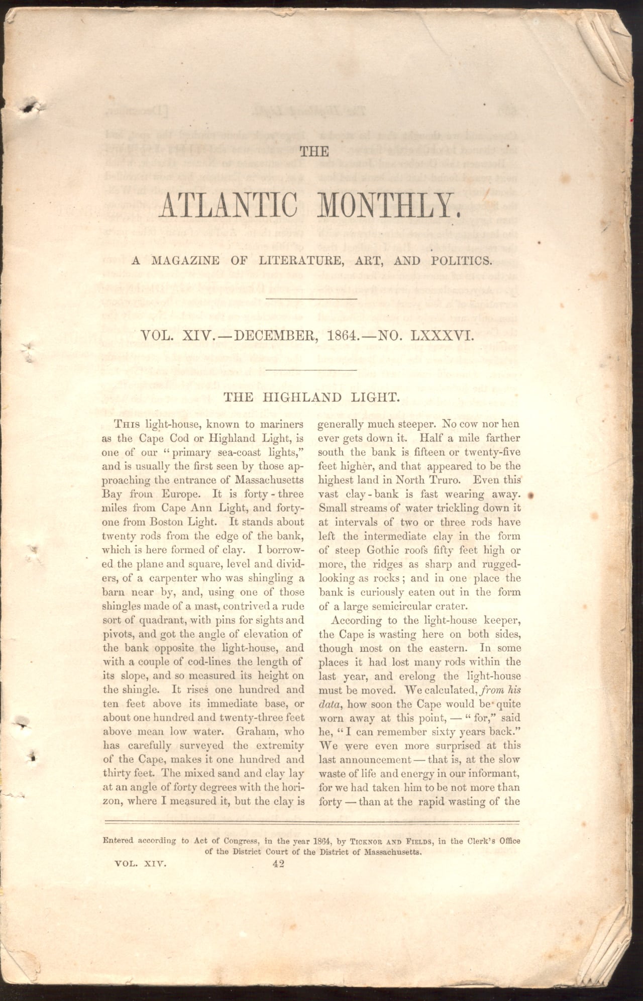 - Thoreau, Henry David. THE HIGHLAND LIGHT. Atlantic Monthly. Vol. XIV. December 1864, pp. 649-659. Disbound. Anyone who truly enjoys reading of the life of a Keeper, or the Cape Cod charm, should surely read Thoreau’s account of his visit with the Keeper of Cape Cod Light during his walk from Eastham to Provincetown in 1849 and again in 1855. Later published in 1865 as Chapter VII in his renown work entitled CAPE COD, this is the first printing of this work in advance of publication. Includes a rare insight into the keeper’s difficulties lighting and maintaining the early array of fifteen Argand lamps. An important early first publication of Thoreau’s sought after work. Disbound. (VG-). $24.