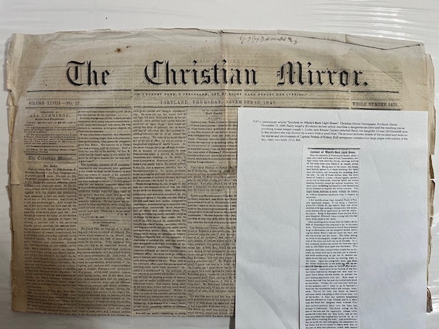 7197-1. (newspaper article) “Incident At Whale’s Back Light House”. Christian Mirror Newspaper. Portland, Maine. November 15, 1849.