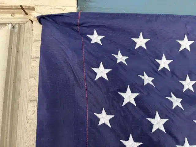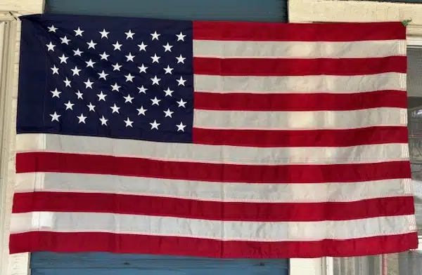 8109-155. [flag] U. S. Coast Guard American Flag.c.1966-. Official U. S. Coast Guard American Flag size (29”h x 48”w). Flag was manufactured for Coast Guard use and is completely intact, made of nylon bunting with embroidered stars. Flag consists of 50 white embroidered stars on a field of blue. Flag is complete with sewn in leather attachments in hem, intended for office use on pole. Manufacturer not noted but with tag noting “2.4 ft. x 4 ft. 100% Nylon RN102722 Made in the U.S.A.”. Rare find, wonderful for your display. Very nice condition, as new. (F-). $24.