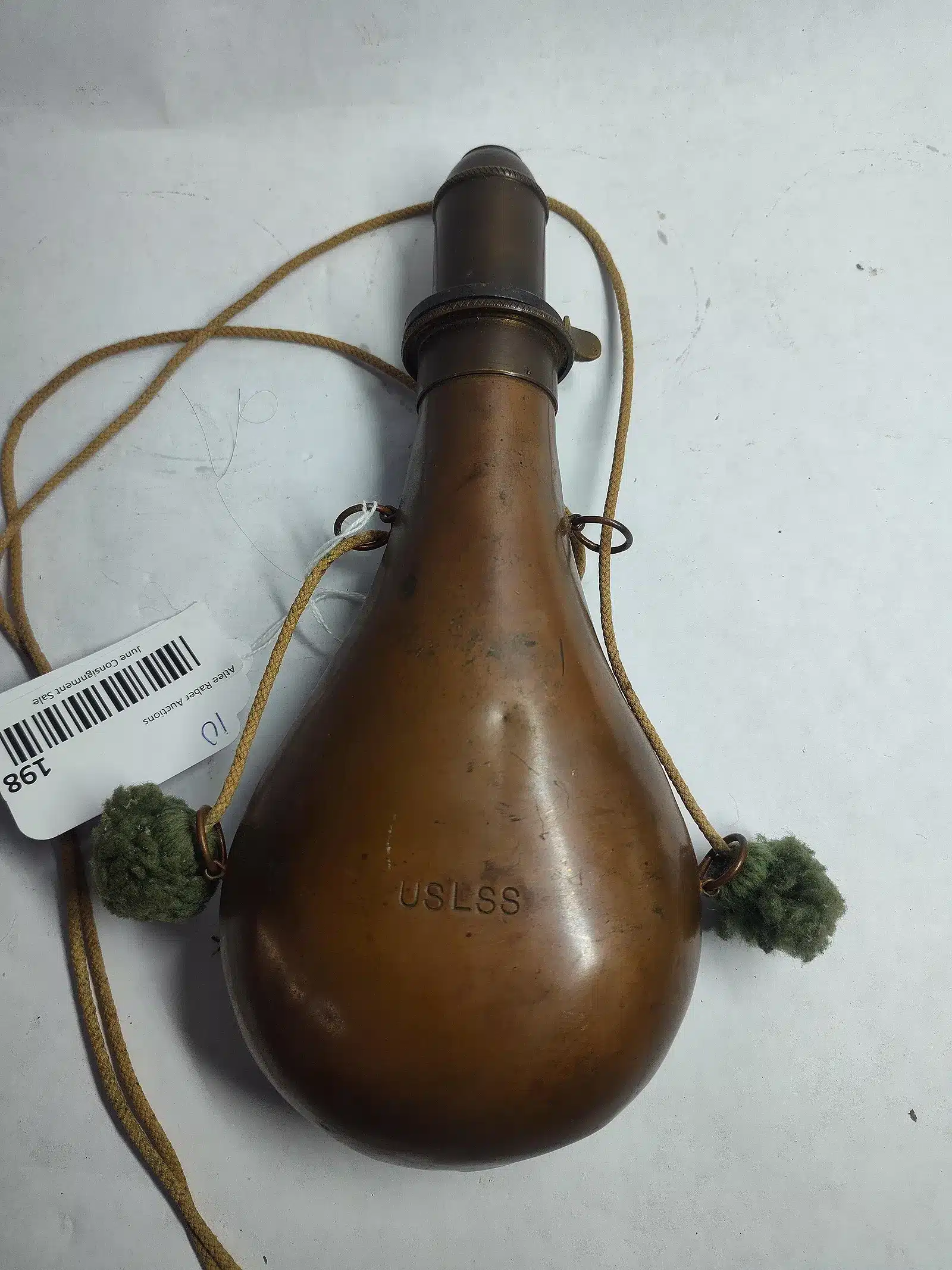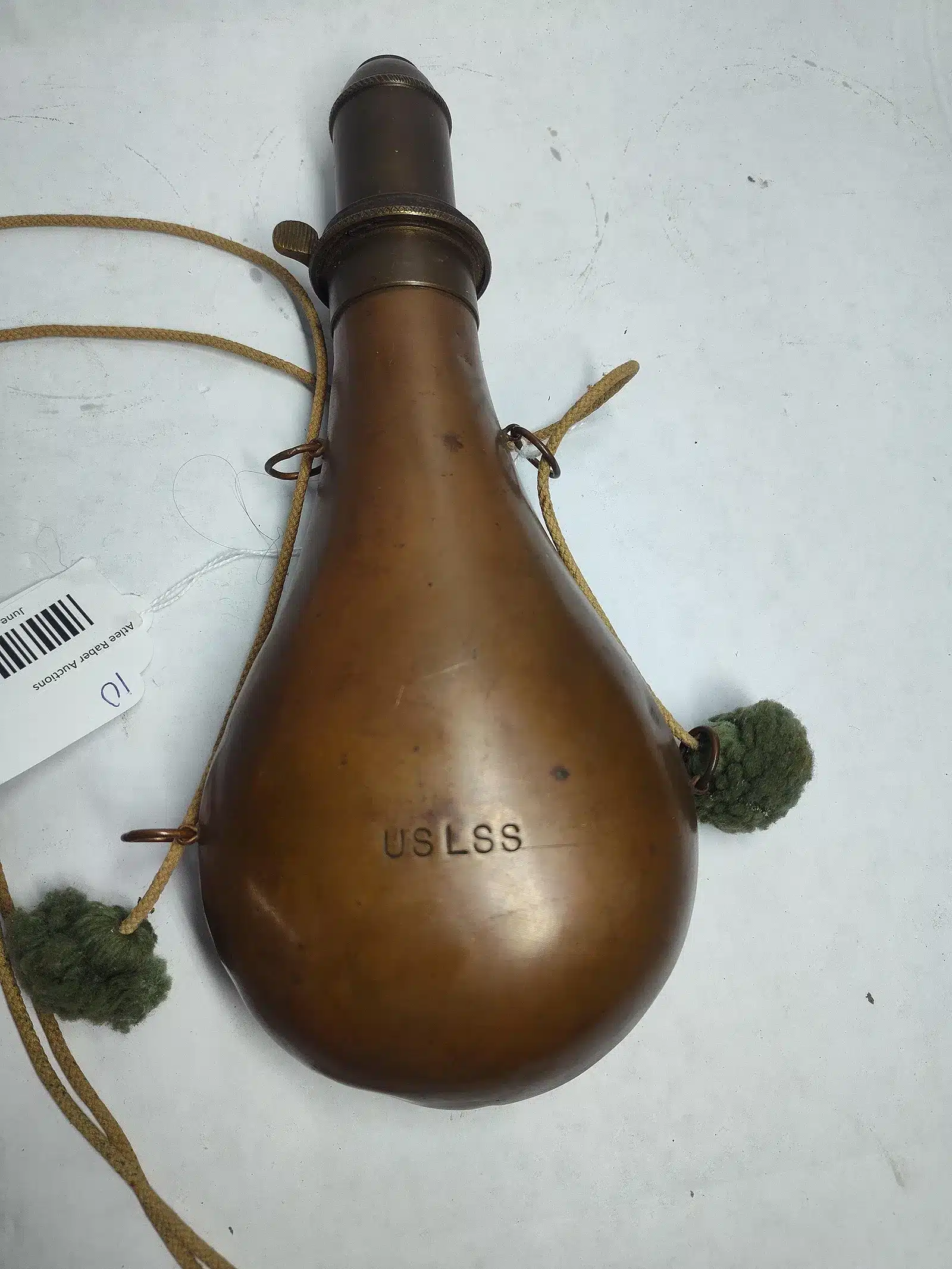 8152n. U. S. Life Saving Service Powder Flask c.1880. Early style Life Saving Service powder flask used by the station crews for priming the Lyle Gun. Flask is of brass and copper construction and measures 10 ½” in length, with four brass loop hangers with early cord lanyard. On each side of the body of the flask are stamped the initials “U.S.L.S.S.”. This original powder flask has only a few very light expected dents and is in wonderful condition and should polish up well, or looks quite nice with its early patina as is. The spring in the charger nozzle is still intact and operable, with original screw on spout. Not marked but likely by “Walton Bros., NY.” [distributor] and “Am Flask & Cap Co.” [manufacturer]. Overall a most presentable rare example of this early Life Saving Service powder flask, one of the nicer that I have had. (VG+). $2895.