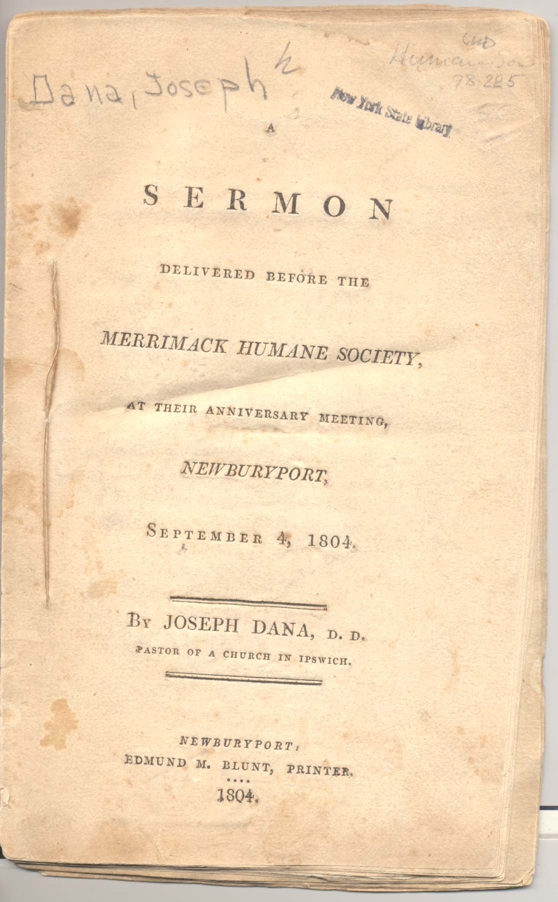 8225. A SERMON DELIVERED BEFORE THE MEMBERS OF THE MERRIMACK HUMANE SOCIETY, AT THEIR ANNIVERSARY MEETING, IN NEWBURYPORT , SEPT. 4, 1804. Joseph Dana. Newburyport . 1804.