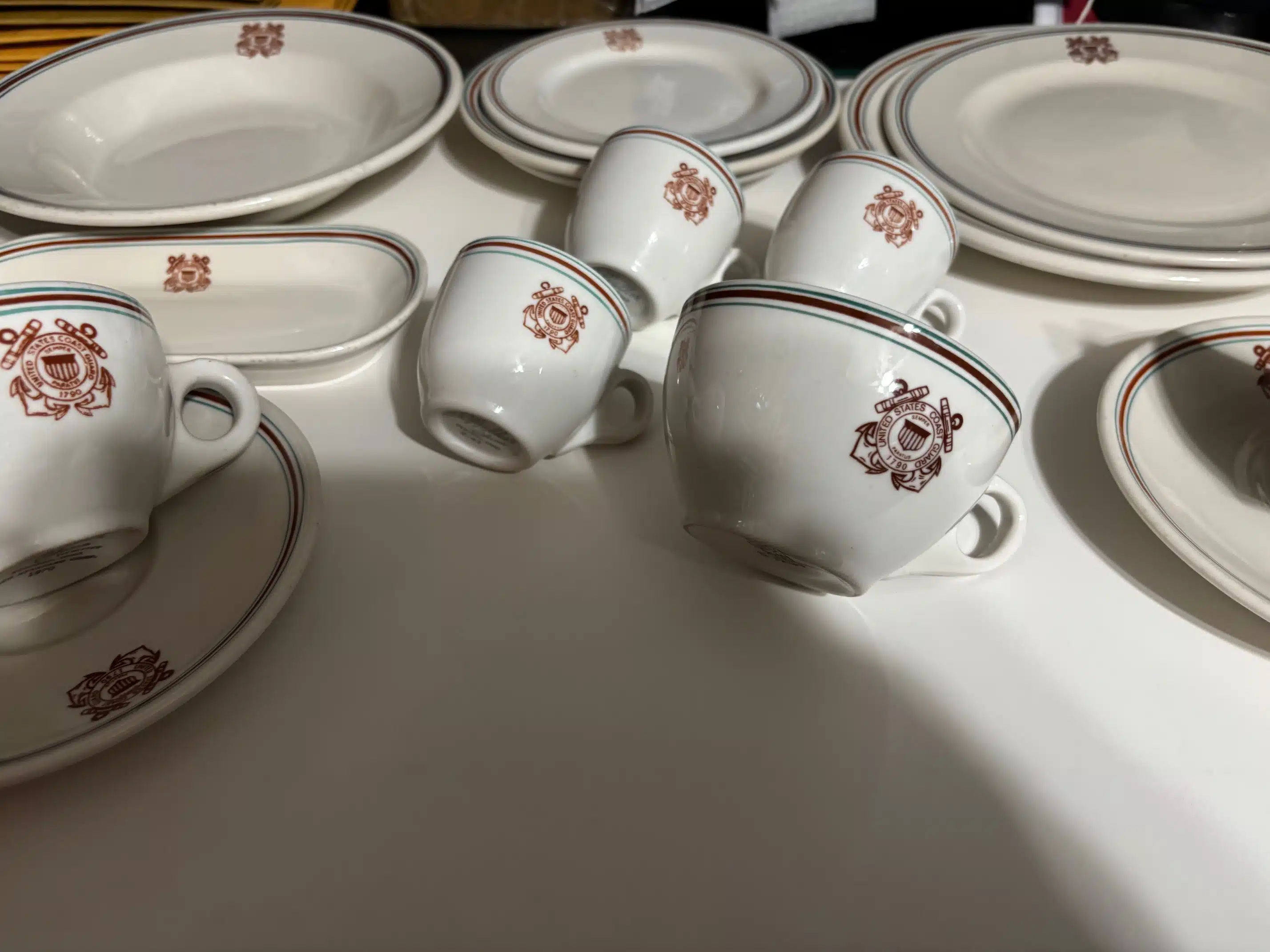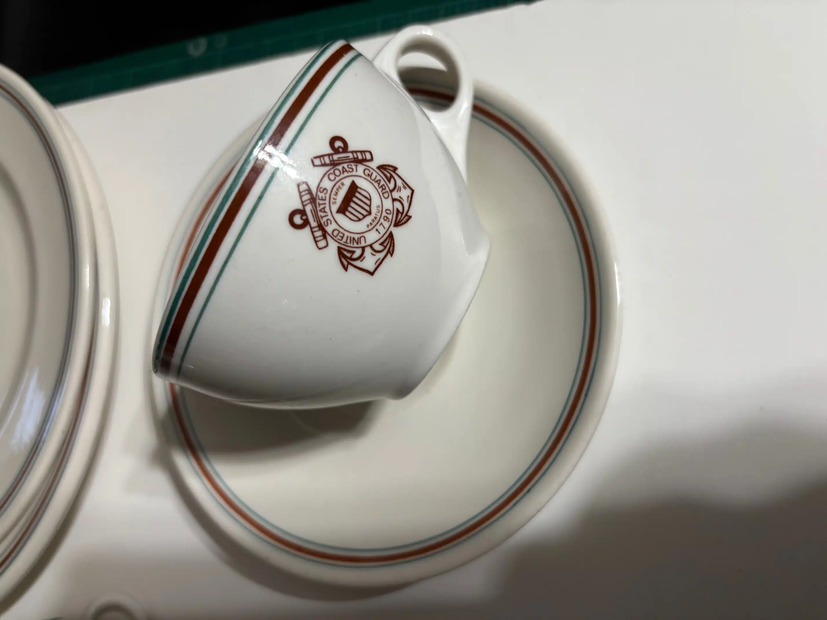 Scarce original early United States Coast Guard cup with saucer manufactured in the later years of the Twentieth Century for use in ships’ wardrooms and at some ‘stag’ stations, of heavy white institutional type china. This pattern is a later pattern which includes one brown stripe around the perimeter bordered by two thin turquoise stripes. Within the stripes are the United States Coast Guard emblem with brown crossed anchors surrounding Coast Guard shield. Dates from 1960’s – 1980’s.