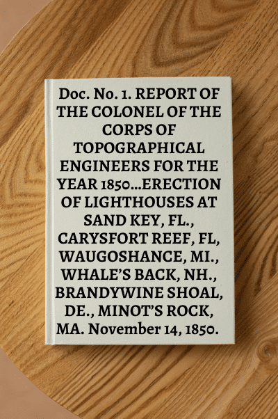 9221b. Doc. No. 1. REPORT OF THE COLONEL OF THE CORPS OF TOPOGRAPHICAL ENGINEERS FOR THE YEAR 1850…ERECTION OF LIGHTHOUSES AT SAND KEY, FL., CARYSFORT REEF, FL, WAUGOSHANCE, MI., WHALE’S BACK, NH., BRANDYWINE SHOAL, DE., MINOT’S ROCK, MA. November 14, 1850.