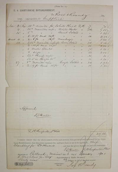 12415. (document) U.S. Light House Establishment. Supplies for Maine Lighthouses. 1st District. c.1870. Form No. 9. Early post- civil war document details items purchased and approved by [signed] J.B. Hull, Light House Inspector, 1st Dist., for repairs made at the following light stations: White Head (nails), Winter Harbor (manila rope), Burnt Island (manila rope, oars), Monhegan (oars), Boon Island (manila rope, oars, blocks, hemp rope, hoops), Eagle Island (manila rope, oars). Total cost approved $29.66. Dated January 6, 1870. Document is signed in hand by J.B. Hull, Light House Inspector, 1st Dist., as approving items as needed and prices as reasonable. Document is in very good condition, three original folds, light edge wear. Measures 13” x 8 ¼”. Great content, important document. (VG). $148.