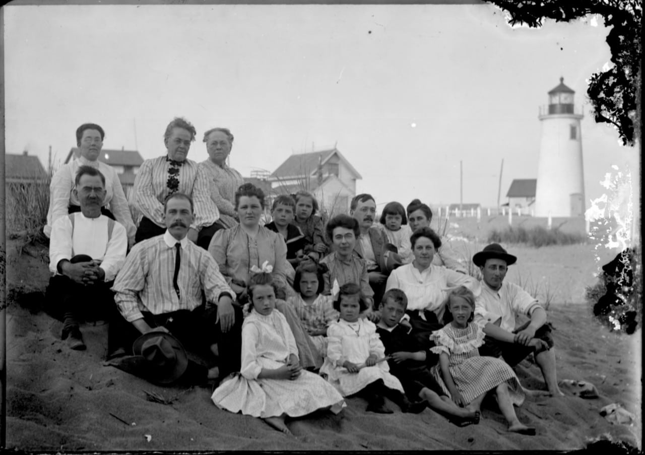 10354. (glass negative) Plum Island Lighthouse, Newburyport, Mass. c.1900. Clear glass plate negative captures nicely the replacement 1898 Plum Island light tower in the background as a group of finely dressed Victorian visitors pose on the sand. Plum Island, a nine-mile long barrier island off the northern coast of Massachusetts. During its nineteenth-century heyday as a resort, steamships and a trolley line serviced Plum Island. The present Plum Island Lighthouse was first lighted on September 20, 1898, probably the third or fourth lighthouse on this site. This photo was likely taken shortly after the station was rebuilt, with a new light tower. Large image measures 5” x 7” and is clear and close. Would provide a clear image. (VG). $42.