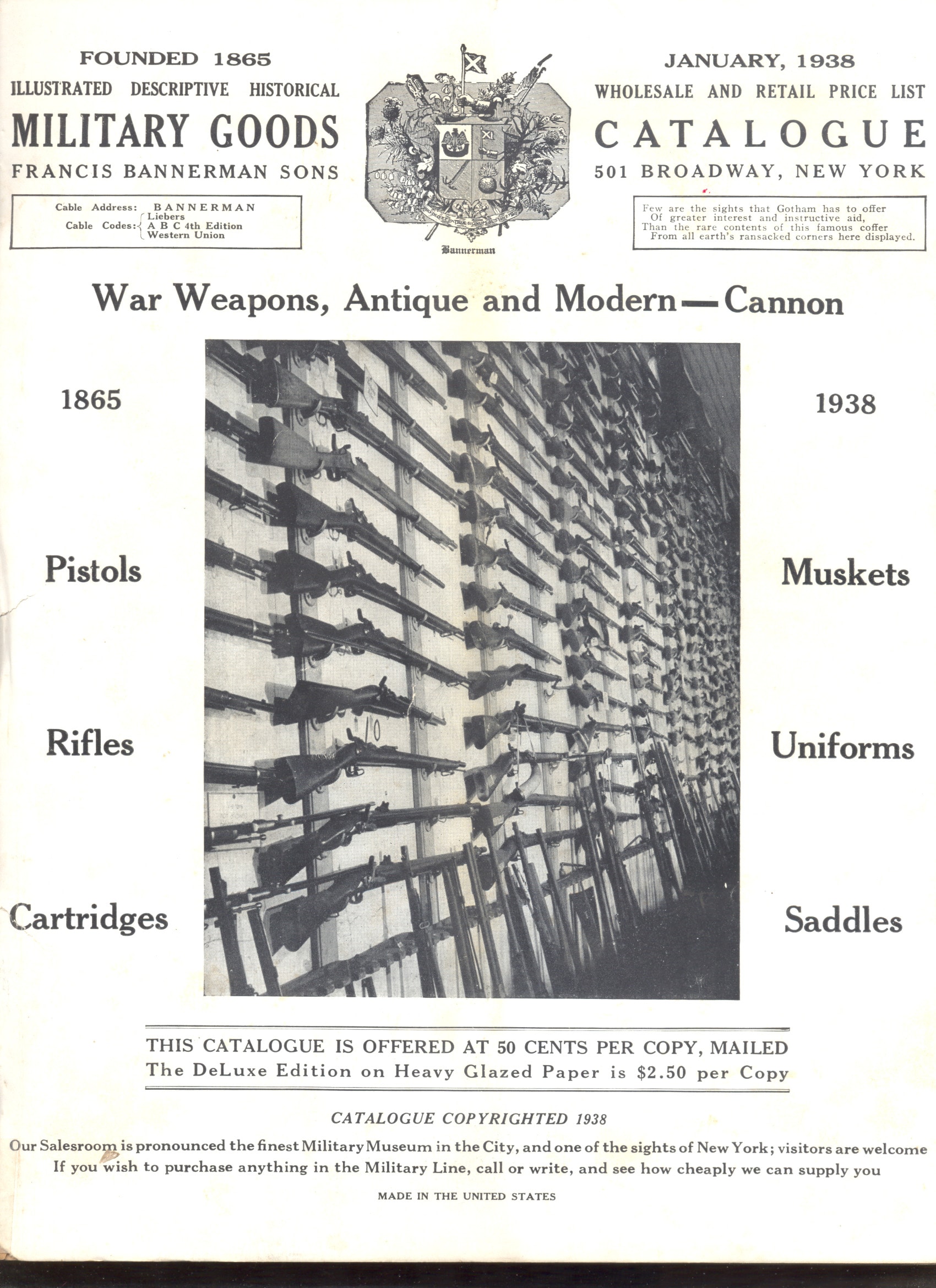 2614. (catalogue) Bannerman, Francis. MILITARY GOODS CATALOGUE 1938 – CANNON, UNIFORMS, GATLING GUNS, AMMUNITION & RELICS. FRANCIS BANNERMAN CO. New York 1938 ed wraps 9″ x 11 ½” 287pp. This extensive catalog is accompanied by the original pictorial mailing envelope (edge worn) and a 1939 correction list. Illustrated throughout. The Bannerman Company dated from the Civil War. They were the first merchants to recognize the value of surplus military goods and became the premier private arms dealer in the world. They bought 90% of the surplus from the Spanish American war and after they were told not to store the 90 tons of explosives in New York , they bought Bannerman Island on the Hudson River . The company prospered until the 1970s. Catalogues of their goods were routinely issued for almost 100 years although the quality of the printing deteriorated over the years as the staff aged and pages were reproduced. Extensively illustrated catalogue includes thousands of piostols, rifles, cannon, cartridges, uniforms, medals, swords, naval lamps, battle lanterns, life rings, binnacles and much more. Some past issues included Lyle guns, Life-Saving Service annual reports for $1 each, lighthouse items and more. Superb reading and a great reference. Pictorial paper covers and contents in good condition, age toning but clean and tight. (VG-). $128.