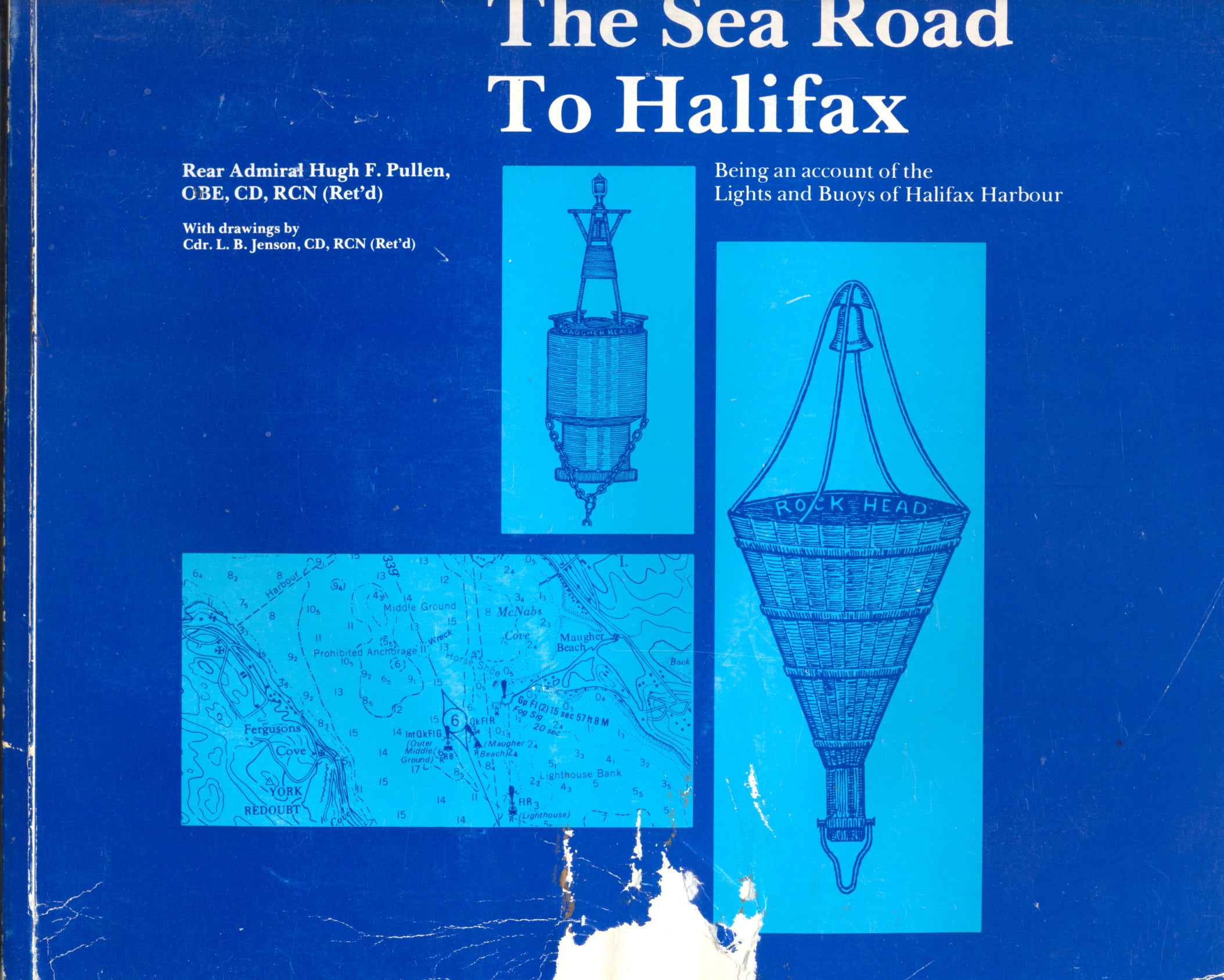 PC-109. Pullen, [Rear Admiral] Hugh F. THE SEA ROAD TO HALIFAX, Being an Account of the Lights and Buoys of Halifax Harbour. Halifax, NS 1980. 80p. Soft wraps. Signed by the author. With 14 rare photographs and illustrations, quite an interesting account of the 225 year history of the lights, light-vessels and buoys of the area. Includes most interesting views of early buoy construction. Includes historical sketches and lists of Keepers, etc. Interesting reading. Clean, tight, has had some moderate dampness to lower half, large 2” chip from cover, light wear. Quite scarce and in demand. (G). $34.