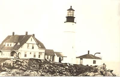 1337. (photo) Portland Head Light Station, Maine c.1934. Close clear photo provides great c.1930’s view from the south of the tall white stone light tower and the later 2 ½-story keeper’s dwellings, out buildings and fog signal building. Located on a rocky bluff, Portland Head Light was a focal point for Victorian visitors. This early view shows good detail of the tower and dwelling and is quite close. One keeper can be seen standing in the doorway at the base of the light tower, probably Keeper Frank O. Hilt or Assistant Robert Thayer Sterling. Frank O. Hilt became principal keeper in 1929. Beginning in 1913, he served as an assistant keeper and then principal keeper at the isolated light station at Matinicus Rock. Hilt remained in charge at Portland Head until 1944. Photo dated September 1934. b/w 3 ½” x 5 ½”. Clear and close. (VG). $22.
