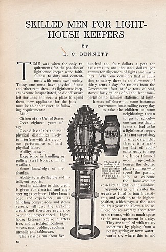 11336. Bennett, E. C., Skilled Men for Lighthouse Keepers. The Technical World Magazine. November 1914. 3p. Disbound. Interesting and informative article on light keeping at the time, and the qualifications needed to obtain such a position. For example: “Time was when the only requirements for the position of lighthouse keeper were faithfulness to duty and contentment with one’s own society. Today one must have physical fitness and other requisites. As lighthouse keepers become incapacitated, or die off, or are left fortunes and seek a place to spend them, new applicants for the jobs must be able to answer the following requirements: Male; citizen of the United States; over eighteen years of age; good health and no physical disabilities likely to interfere with the vigorous performance of hard physical labor; ability to swim; experience in handling or pulling sail boats, in all weathers; some knowledge of mechanics; ability to write legible and intelligent reports….” Illustrated with 5 photos. Clean, crisp. (VG+). $24.