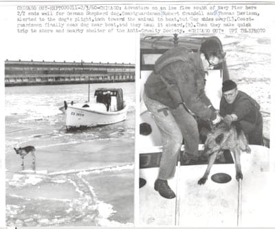 3003. (photo) U.S. Coast Guard 36-Foor MLB Dog Rescue c.1960. Clear, close, original 7” x 9” press photo shows good detail of Coast Guard Motor Lifeboat CG-36519 from Chicago as they maneuver to effect a rescur of a German Shepherd stranded on an ice floe in the harbor. Photo is b/w and includes date and description. Clear, close view, great detail. (VG+). $38.