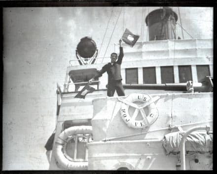 14321. (glass plate negative) U.S. Coast Guard Cutter Mojave (WPG-47) c.1929. Great view of the bridge as a seaman appears to be signaling with semaphore flags. USCGC Mojave was a 240-foot Tampa-class Coast Guard Cutter in commission from 1921 until 1947. This ship was one of four sisters: the TAMPA, MODOC, HAIDA, and MOJAVE. Built- in 1921 at Oakland, CA, these ships were named for Indian tribes. Displacement was about 1800 tons, 240 foot length with a 39 foot beam. Powered by a 200 KVA electric motor turbo generator which was driven by two Babcock and Wilcox boilers. A single screw could push her along about 15 knots. Photo is quite close and unusually clear and provides great detail. Measures 4” x 5”. Will make fine print. (VG+). $68.