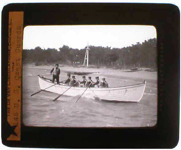 28197. [glass slide] U.S. Coast Guards in Surfboat. #146. c.1920 by De Vry Circulations, Chicago, Ill. Beautiful b/w glass projection slide featuring the early Coast Guard crew drilling in their surfboat, with the station drill pole in the background. Slide measures 3 ¼” x 4” and presents a superb, clear image. (F). $68.